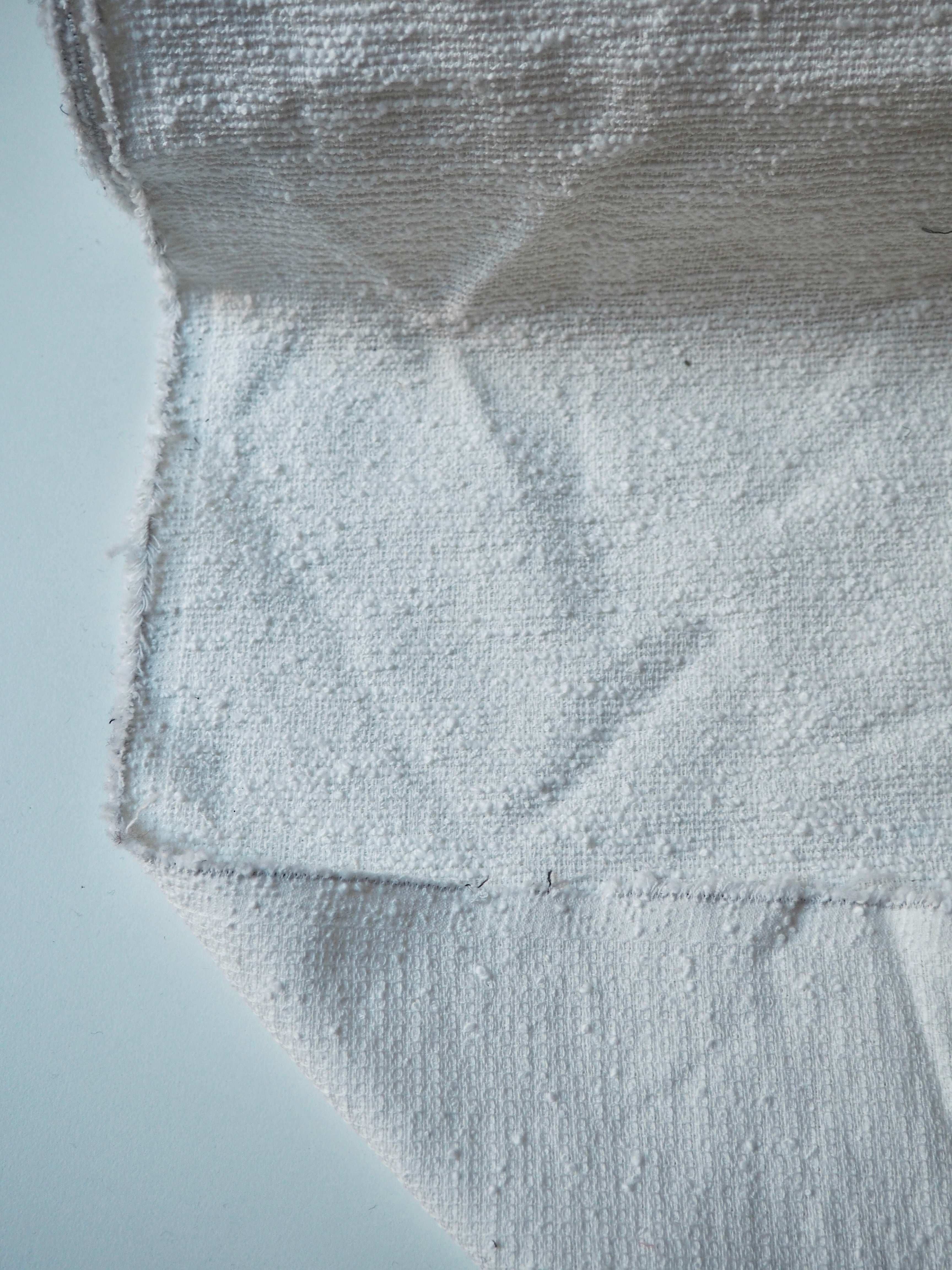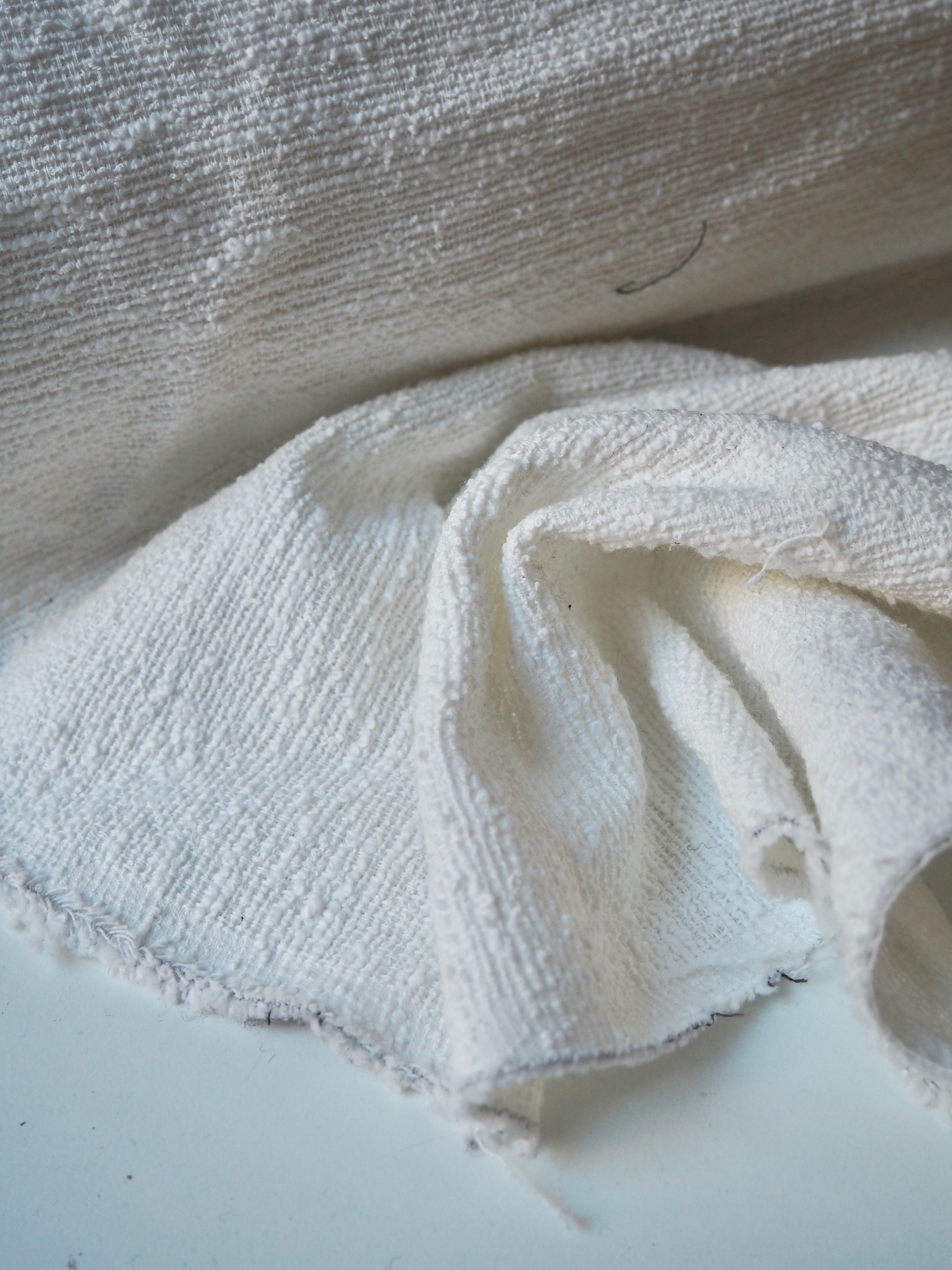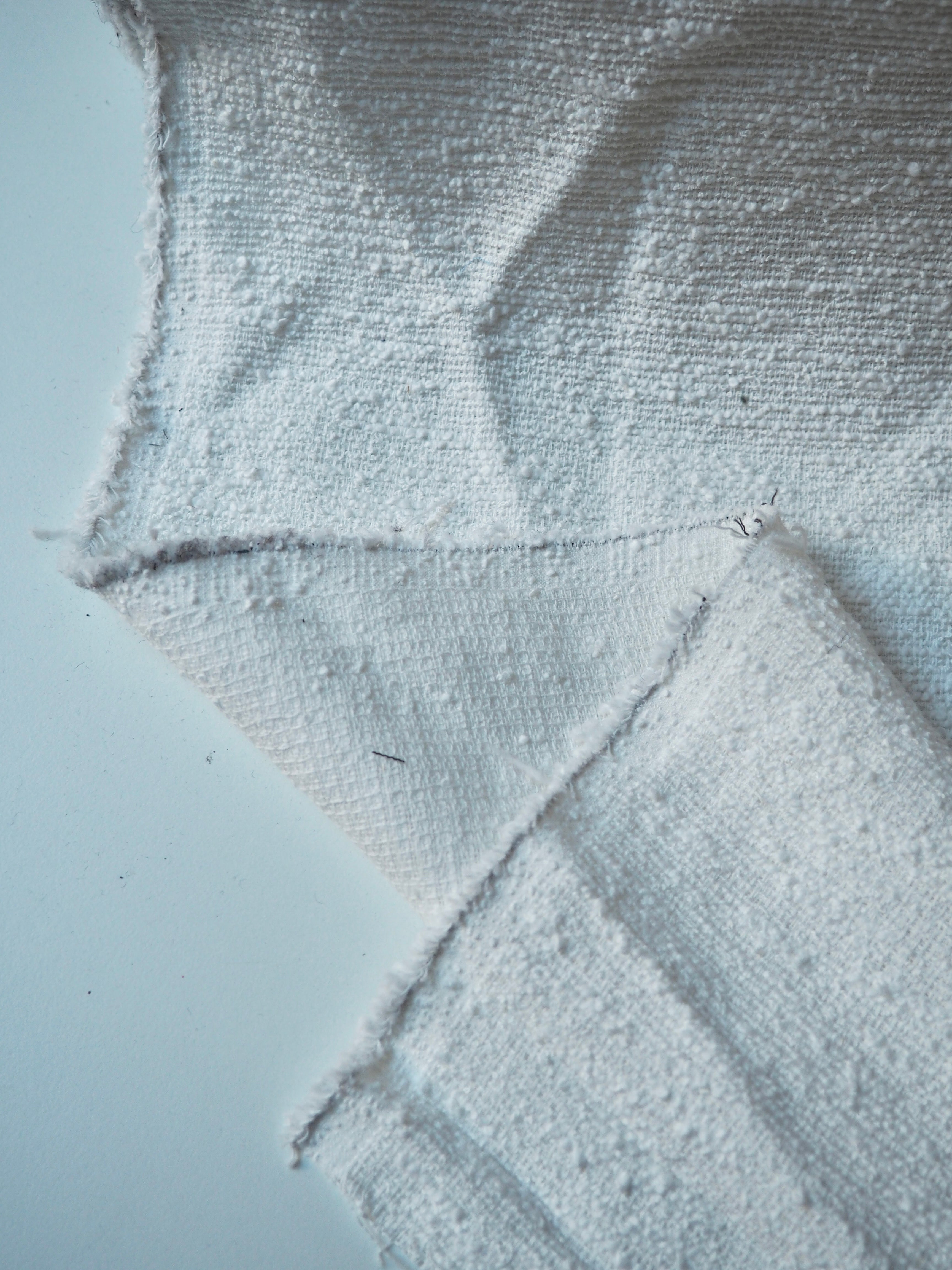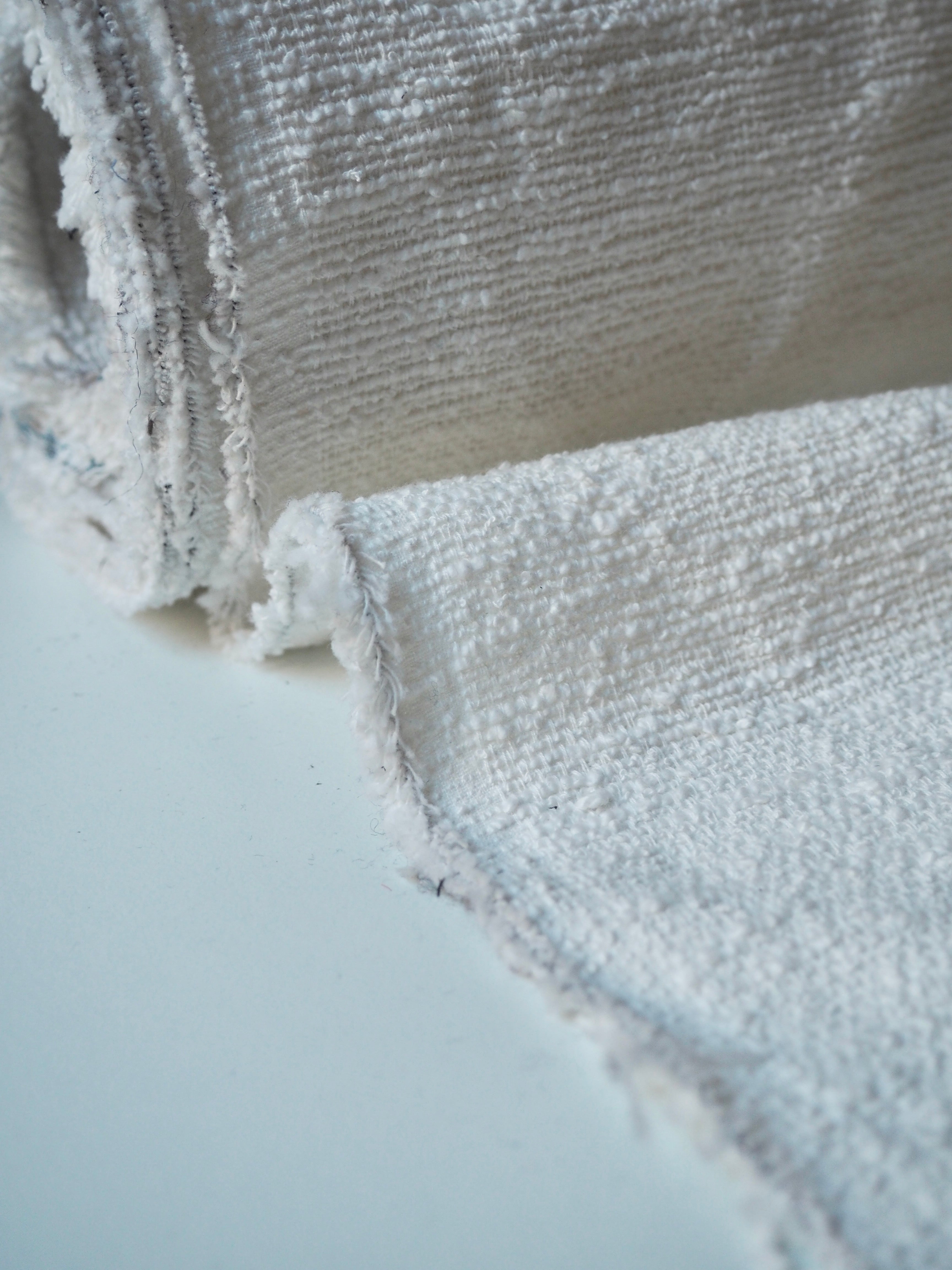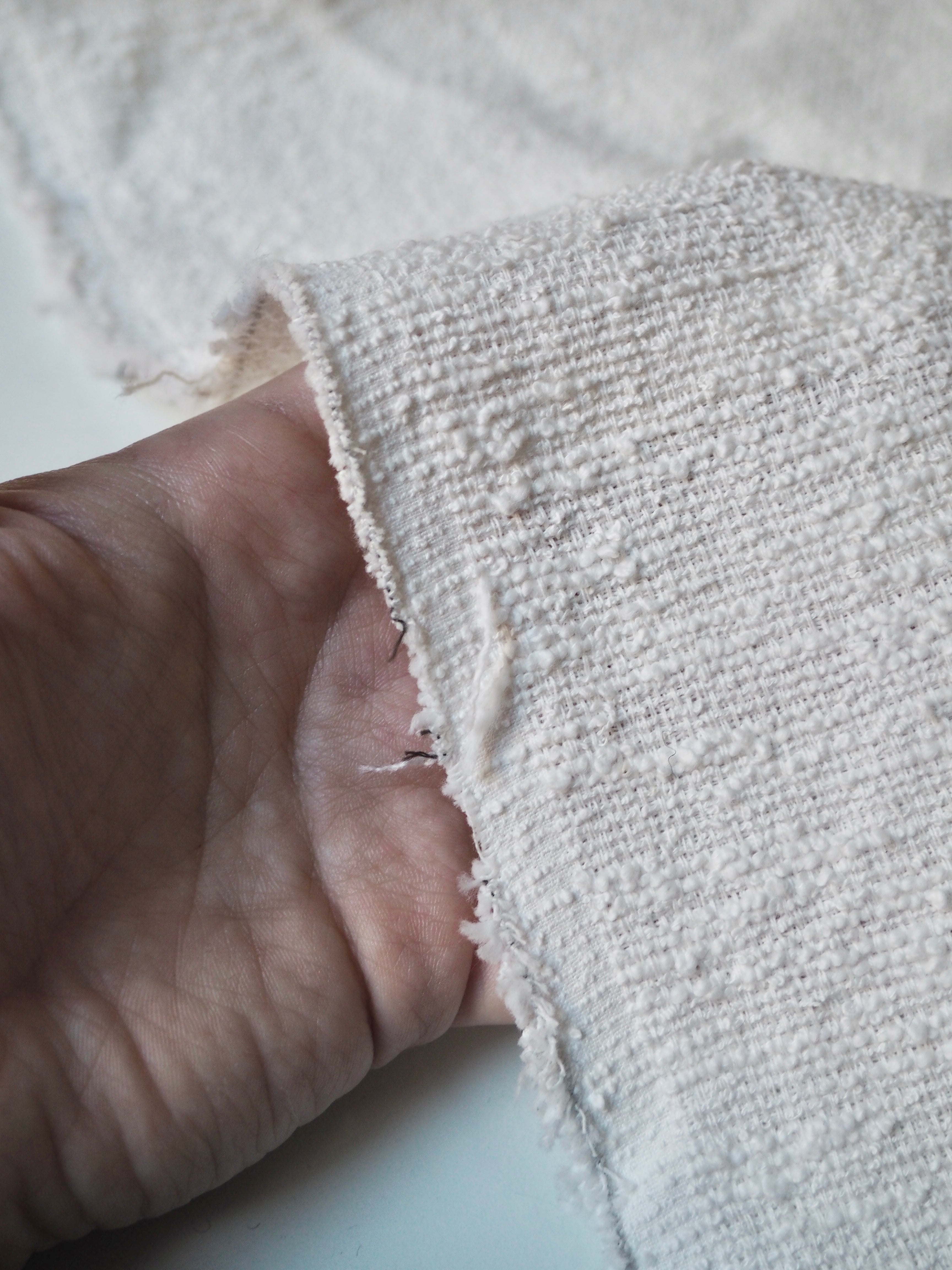 This ex-designer fabric is a cotton tweed. It has a sturdy but very soft and textured bouclé weave. It's opaque, with a gentle structure and lovely drape. Has such a lovely handle that's easy to work with. Light to medium weight and perfect for a jacket or even cushion covers!