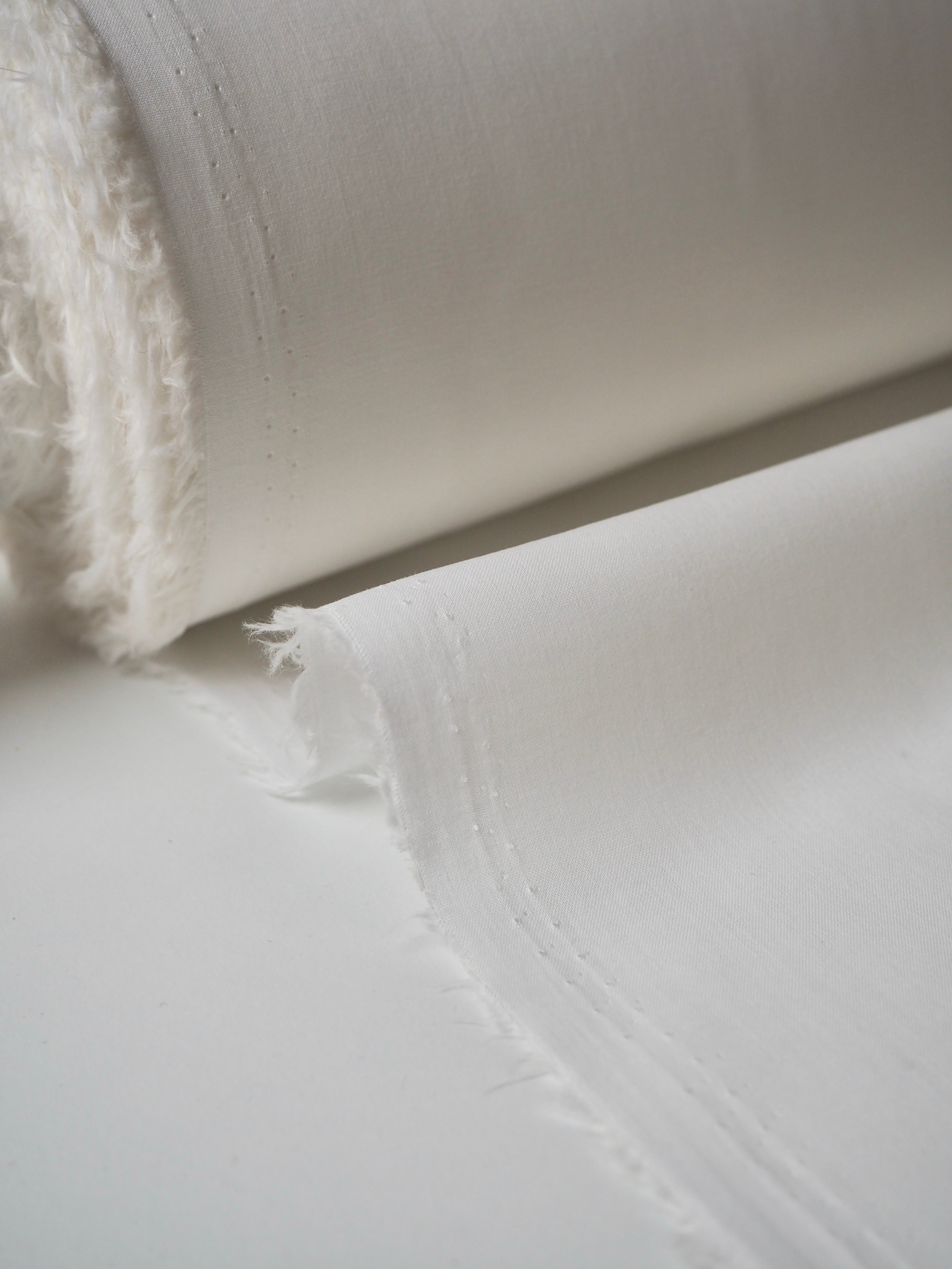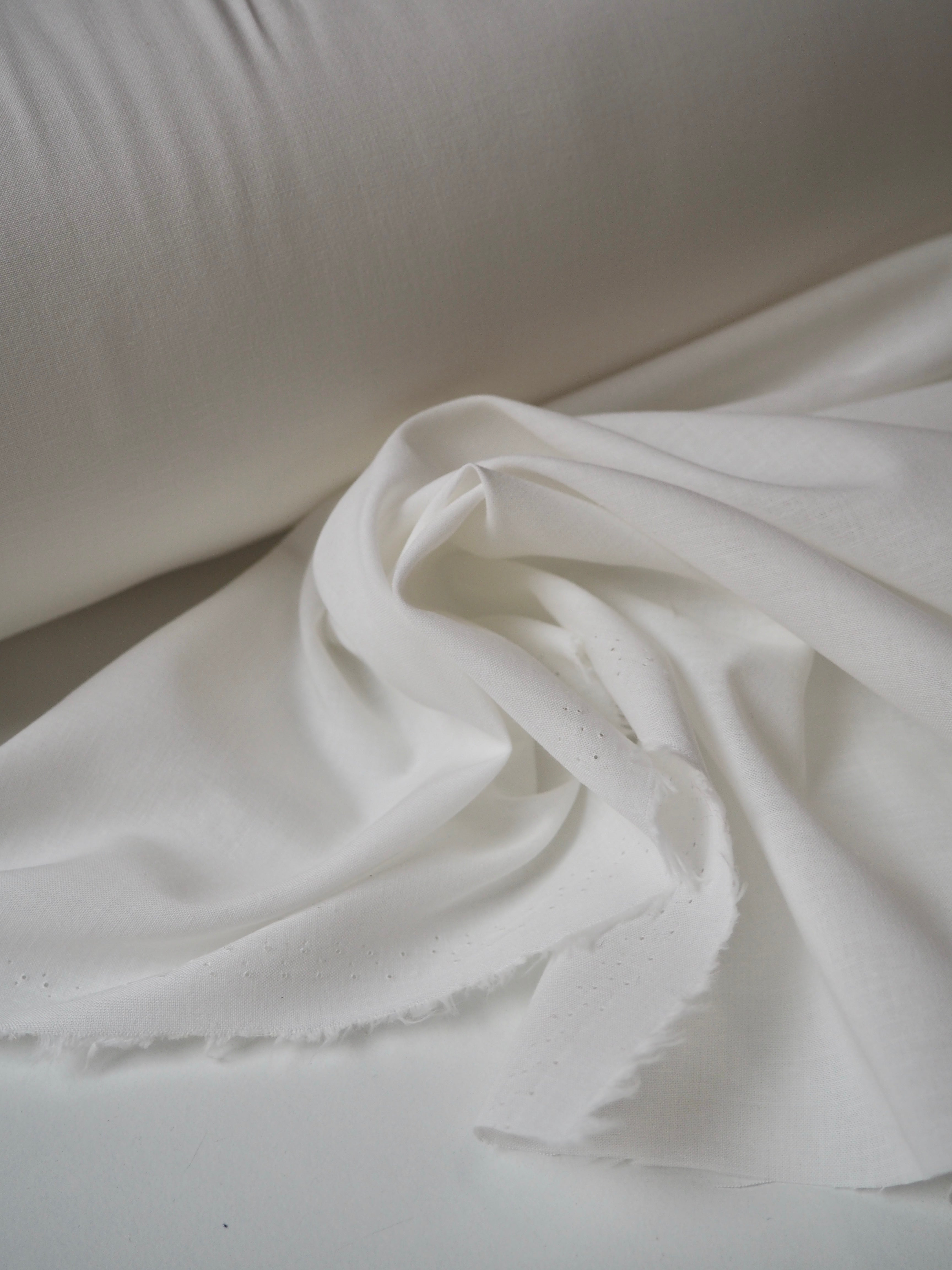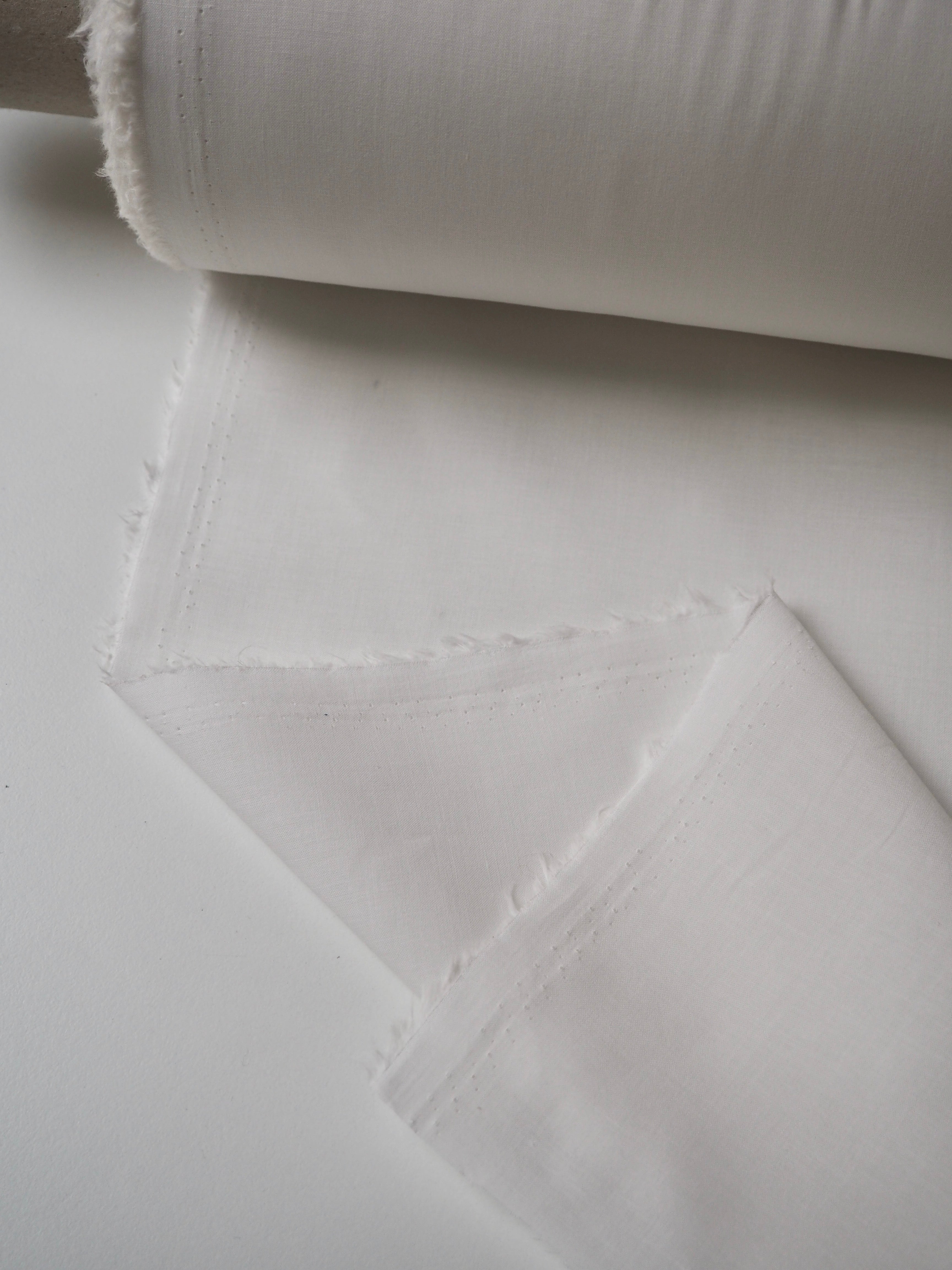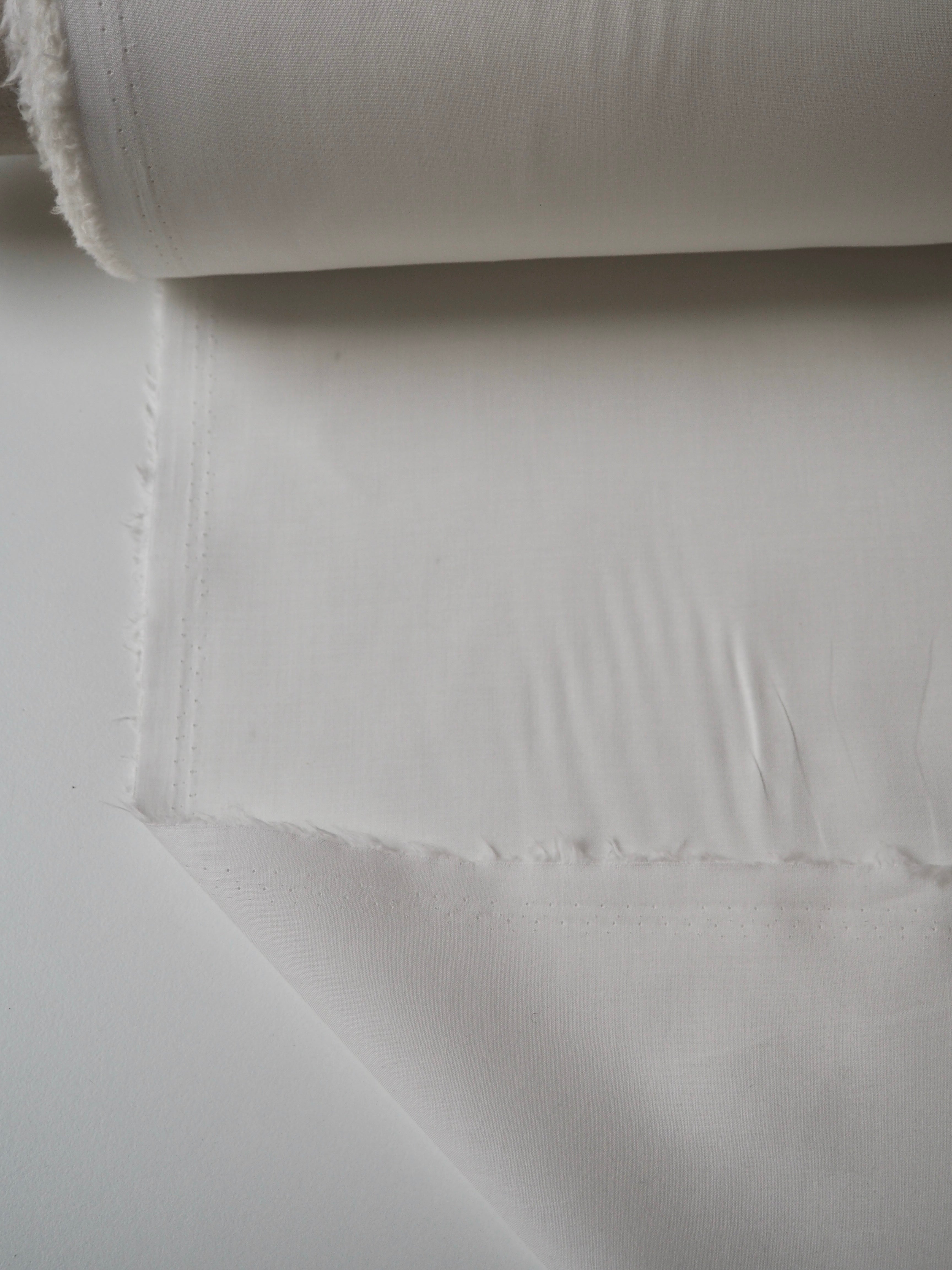 This ex-designer fabric is a voile. It's lightweight, airy and semi-sheer. It has a flat finish and a lovely, soft cotton handle. In classic white and has a light drape, and very slight crispness that haves a bit of structure. Ideal for lining tops and dresses!