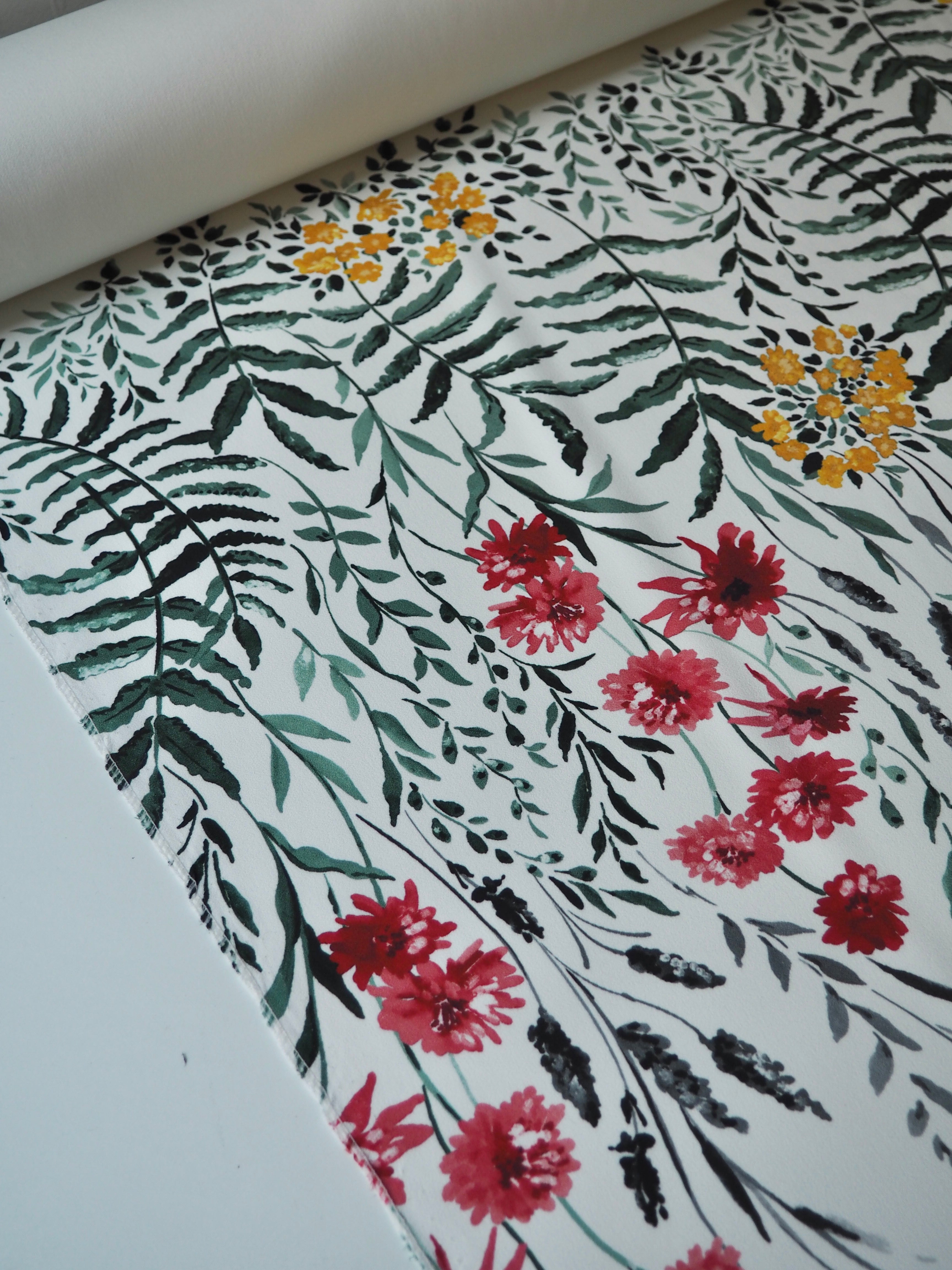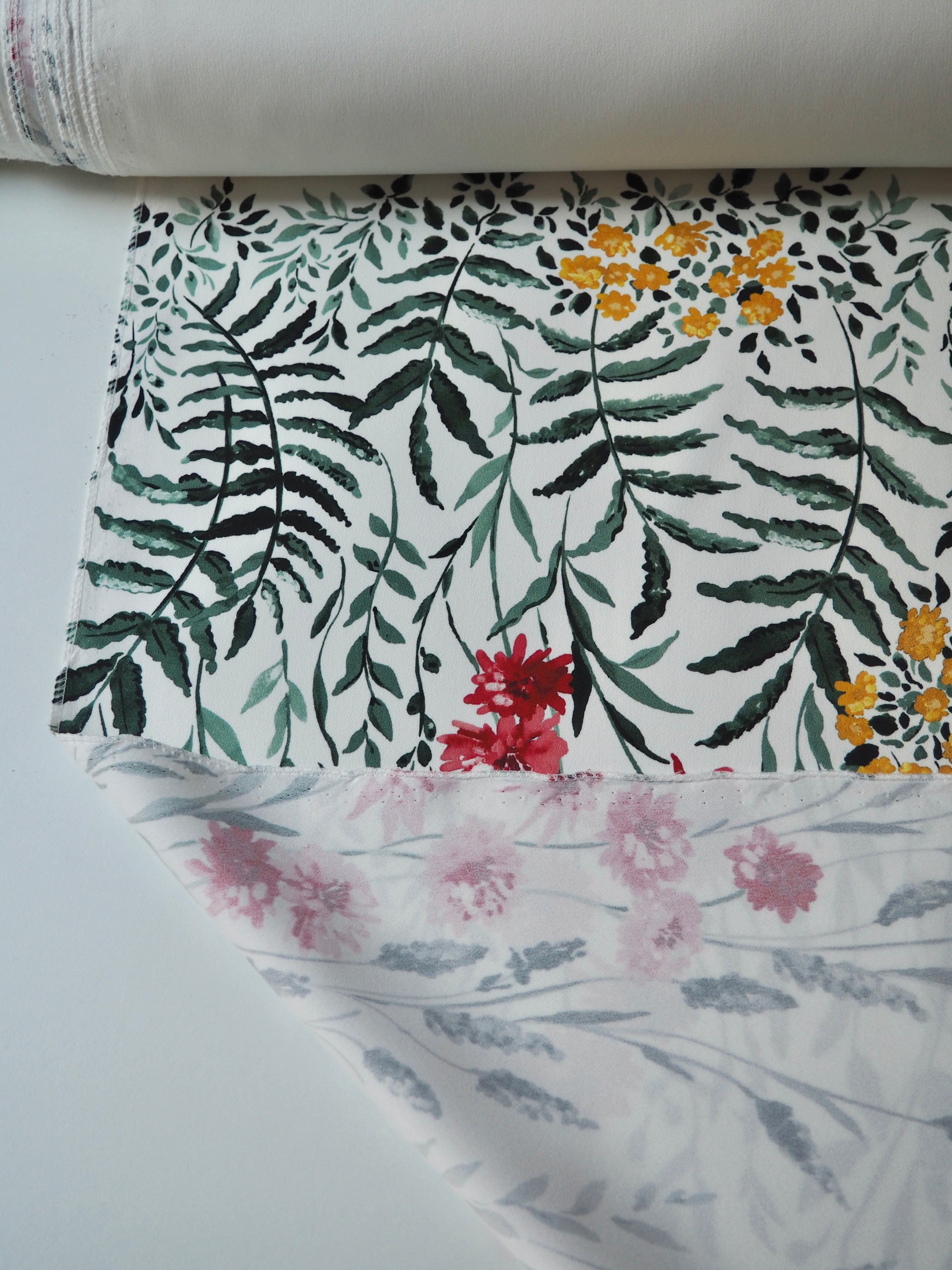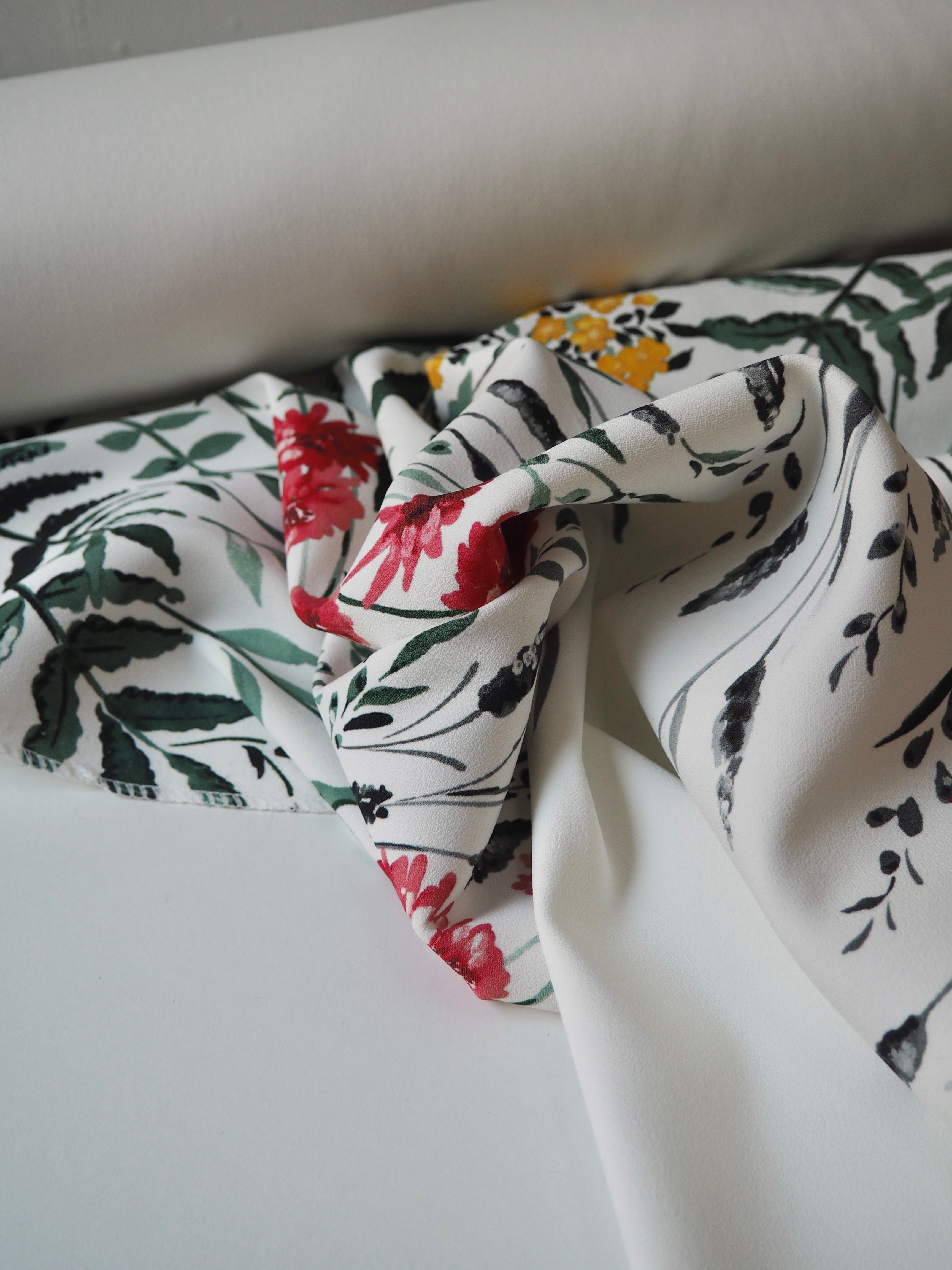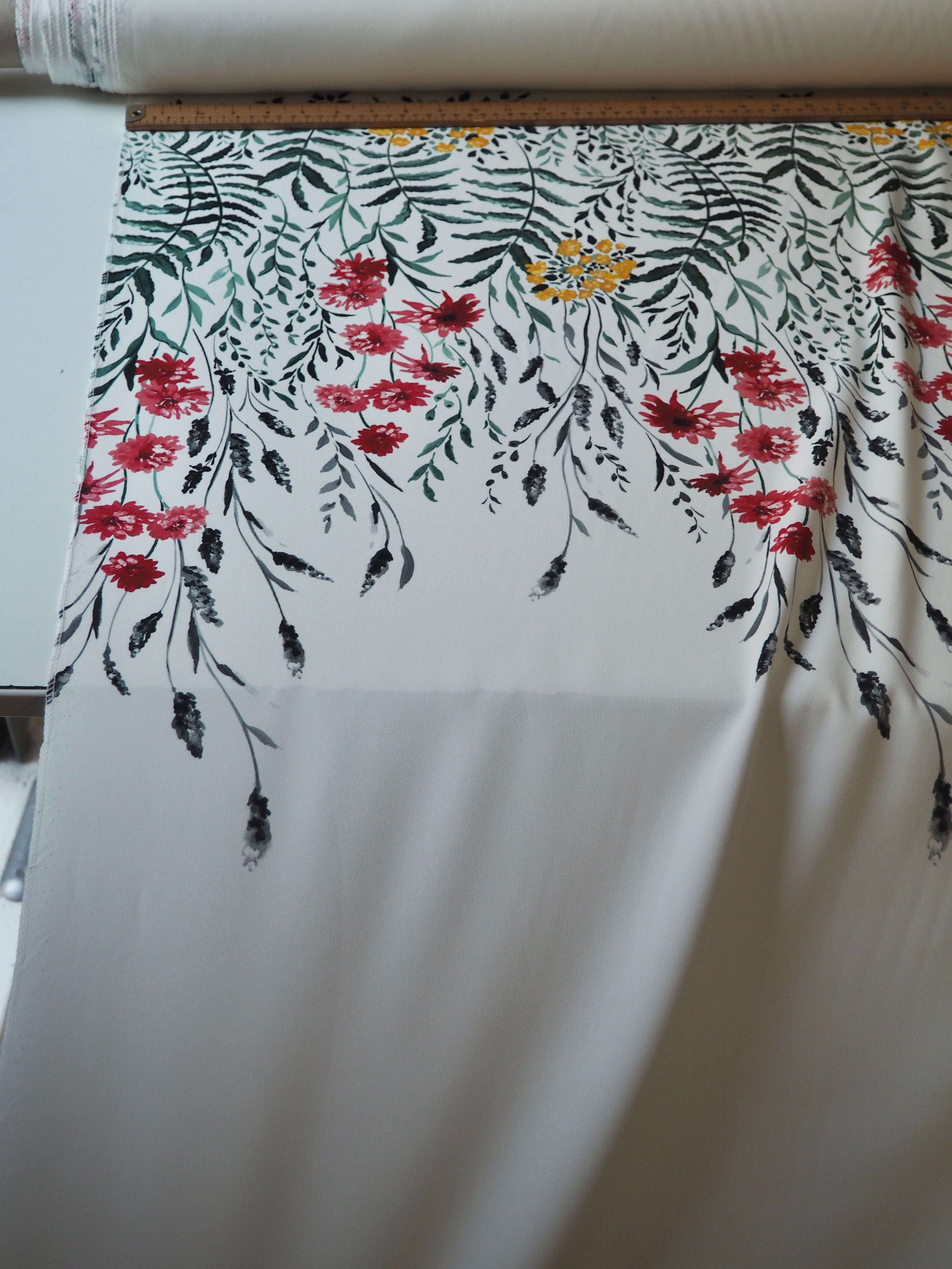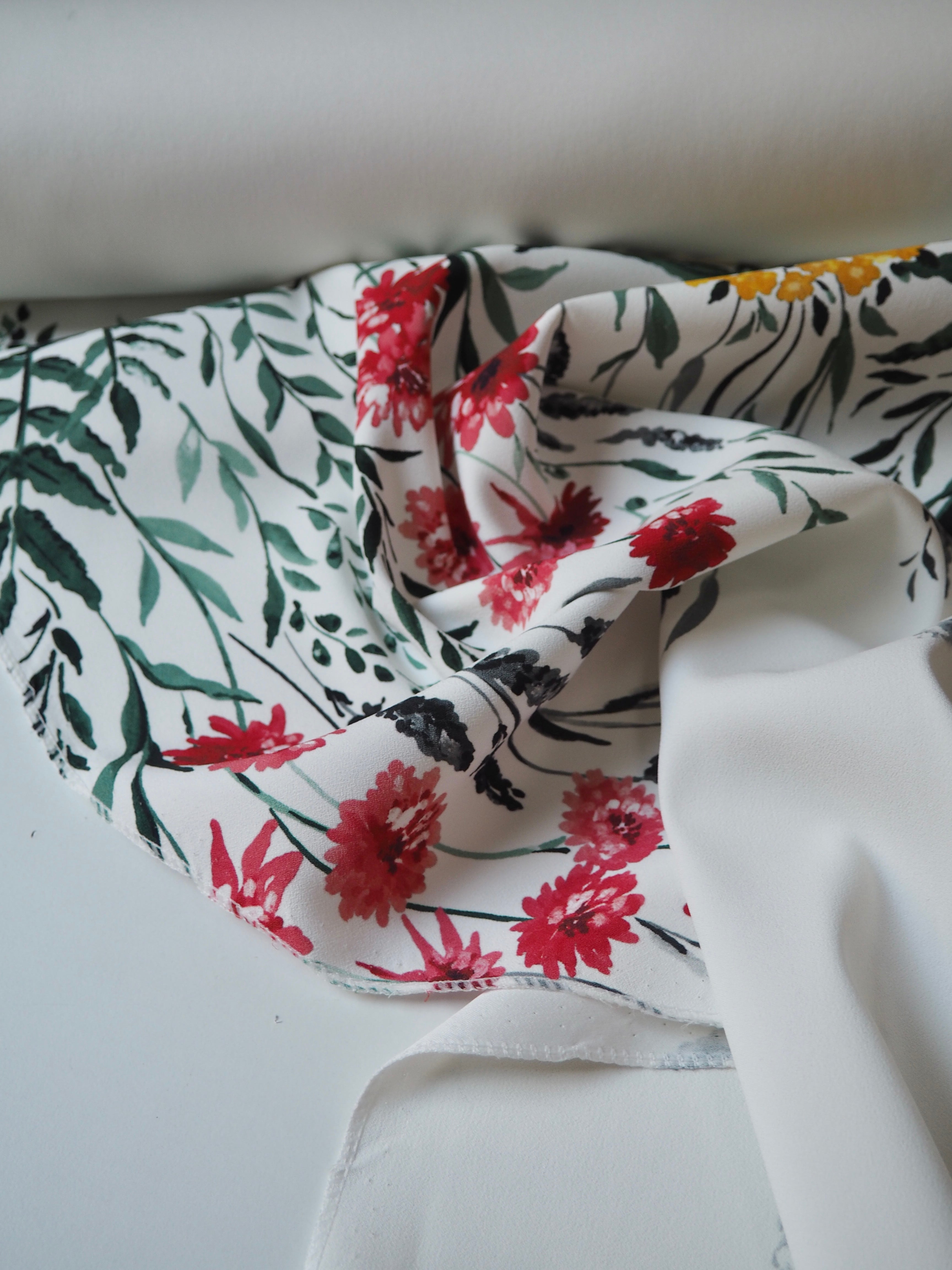 This ex-designer fabric is a lovely floral crepe. It's white with a floral pattern printed on the crepe topside, and a smooth satin reverse. It stretches about 15-20% width ways. Has a lovely handle and rich colours! Has a slightly heavier drape and is mostly opaque, pretty fully opaque for a white cloth. Would feel lovely against the skin and be perfect for a panelled dress or top, even trousers!