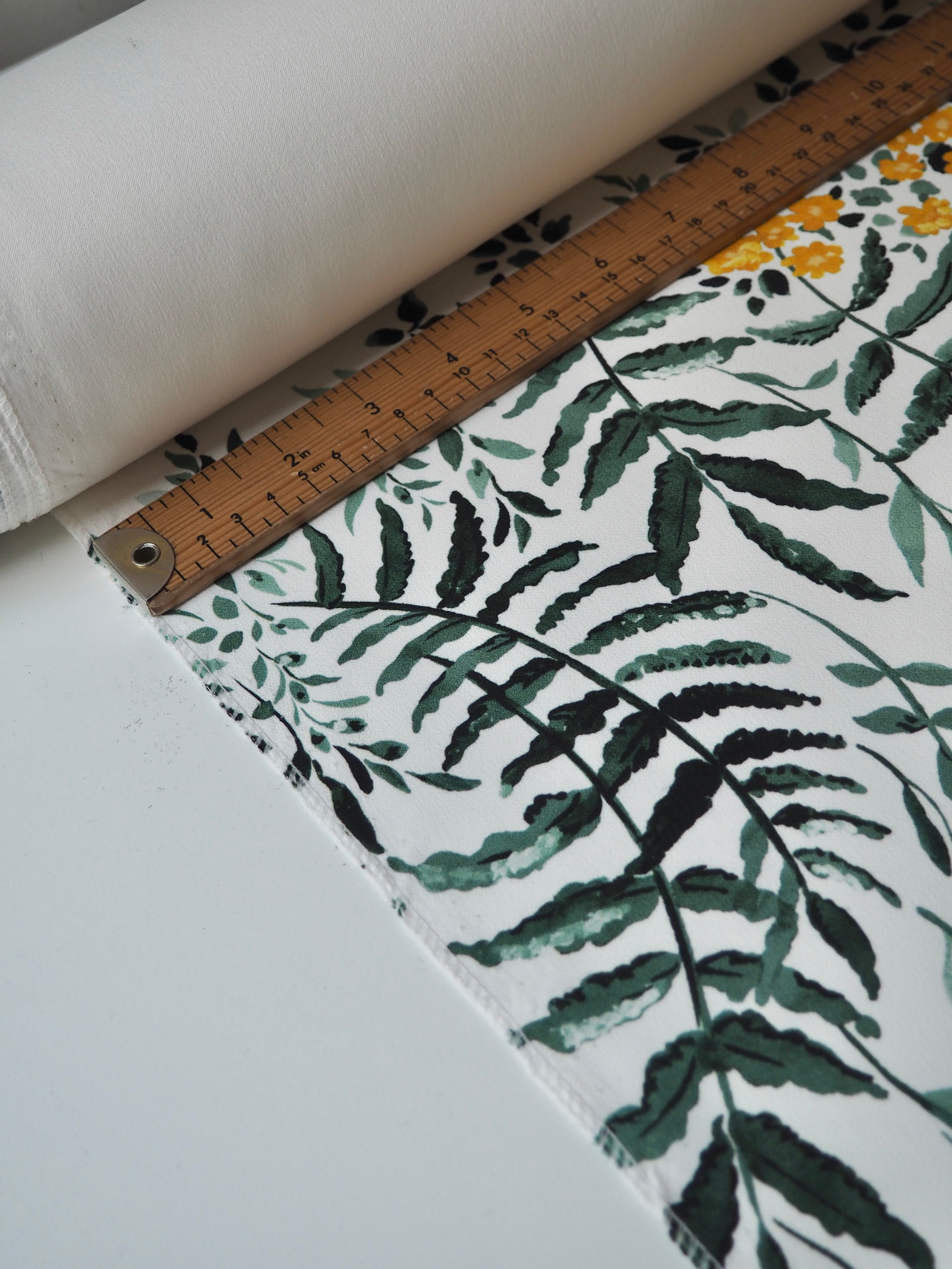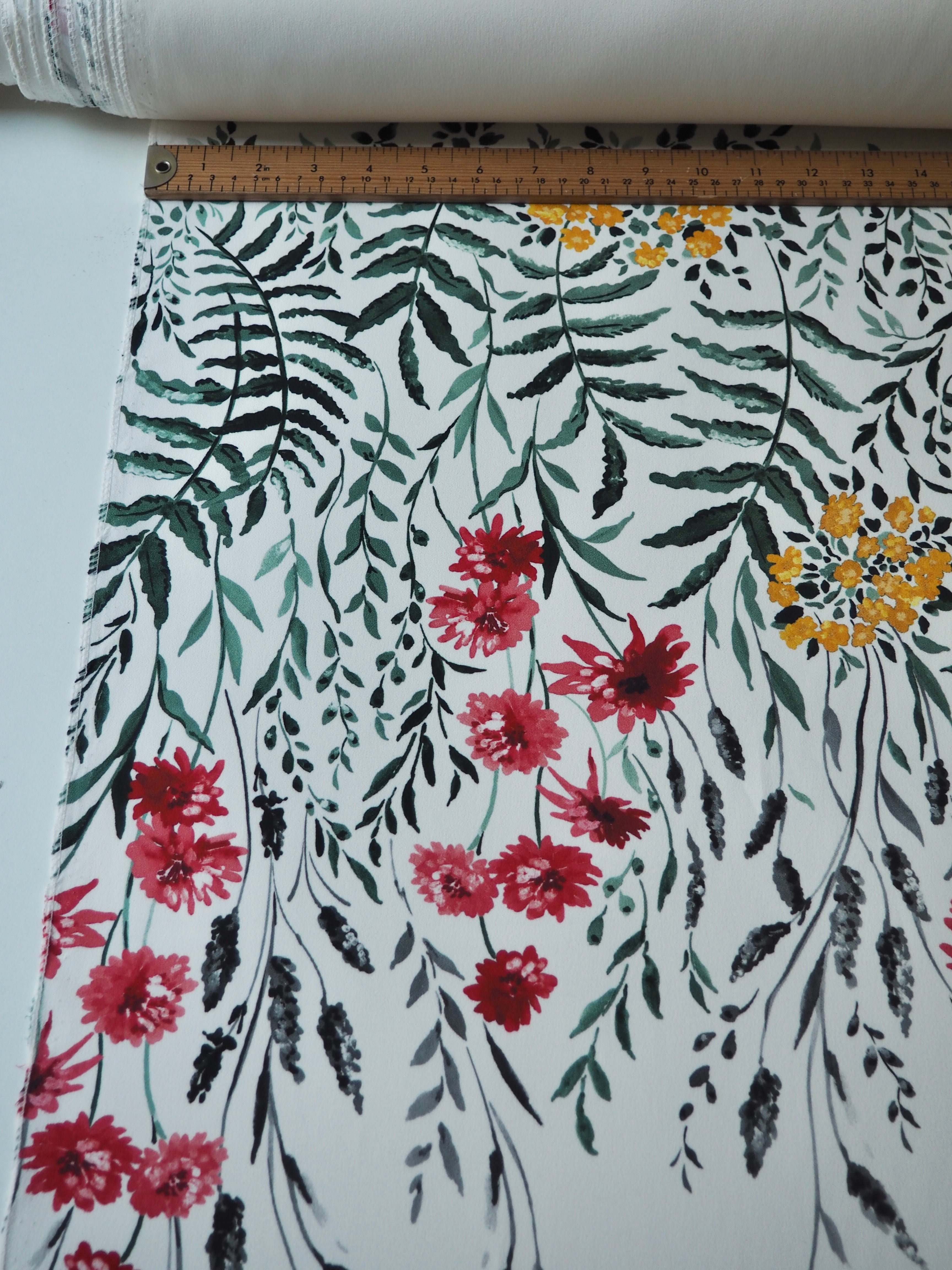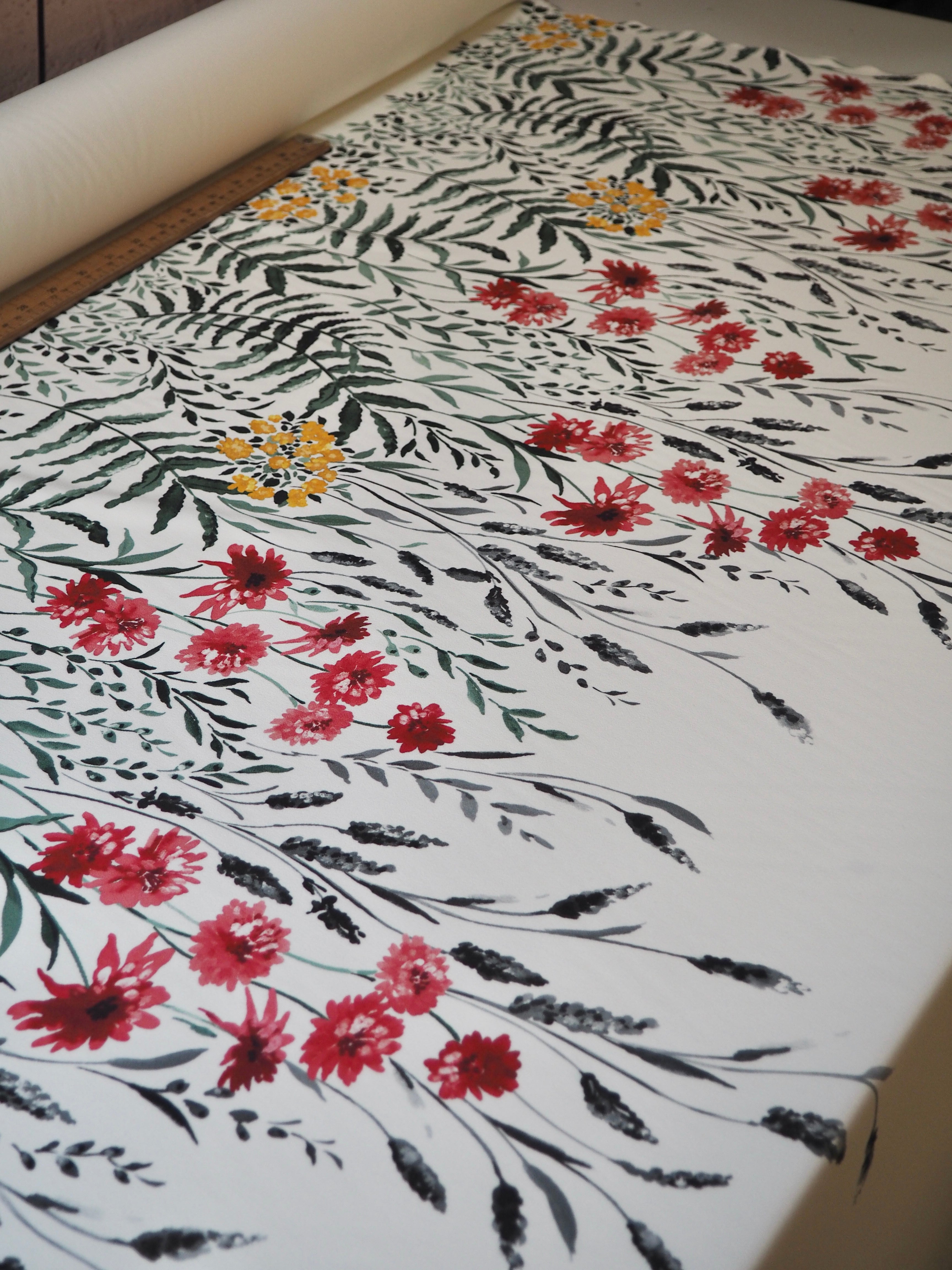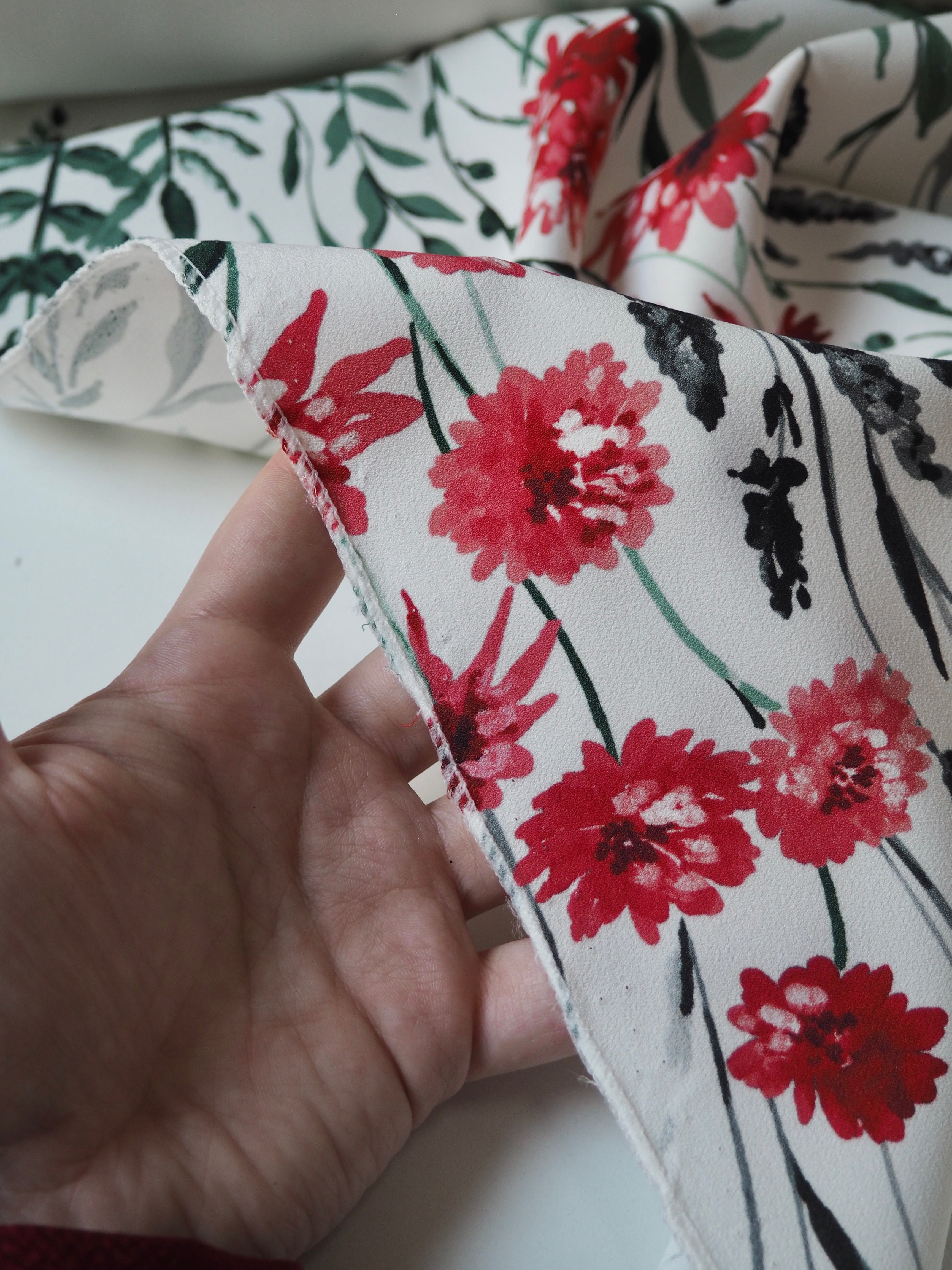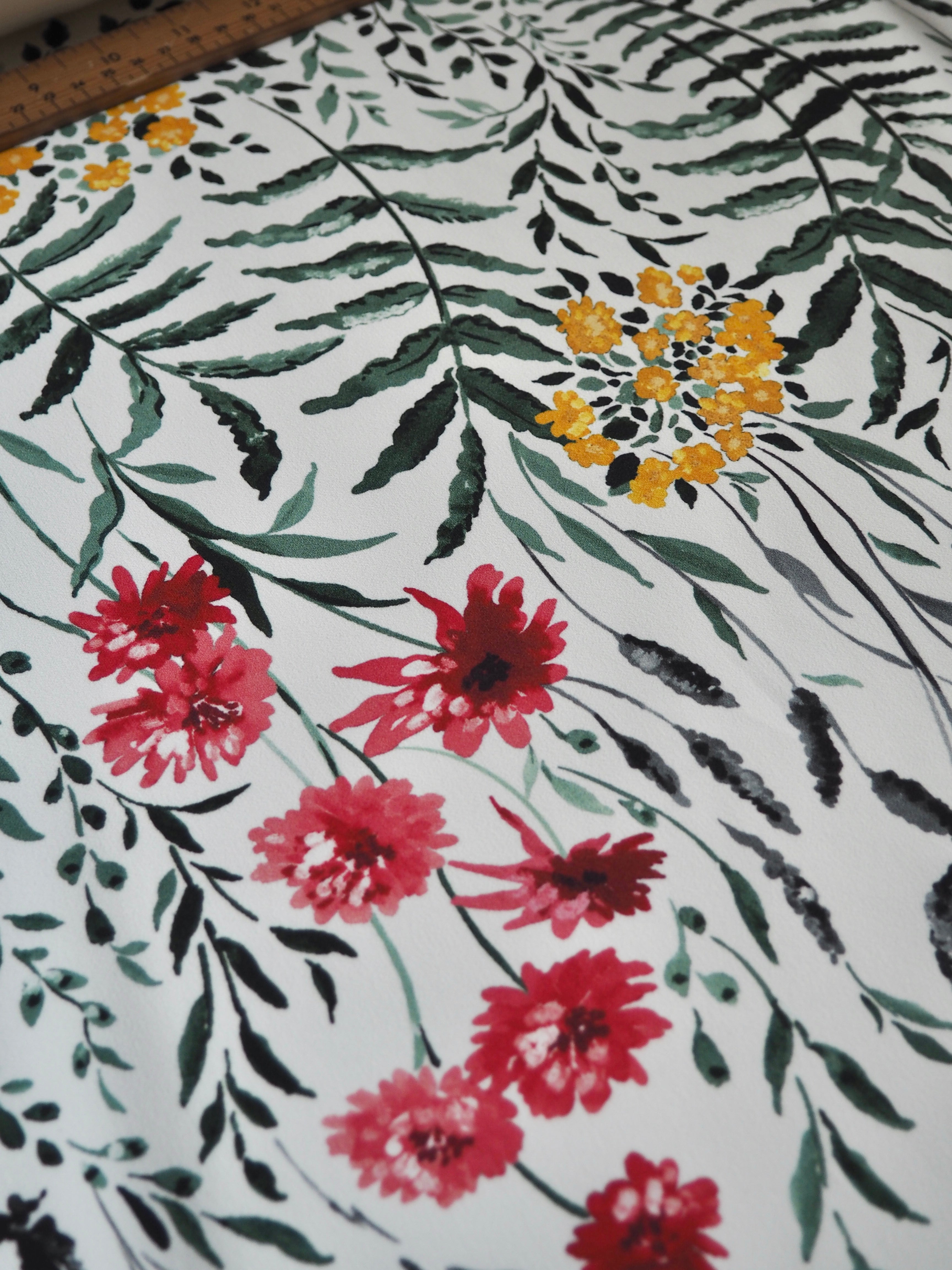 This ex-designer fabric is a lovely floral crepe. It's white with a floral pattern printed on the crepe topside, and a smooth satin reverse. It stretches about 15-20% width ways. Has a lovely handle and rich colours! Has a slightly heavier drape and is mostly opaque, pretty fully opaque for a white cloth. Would feel lovely against the skin and be perfect for a panelled dress or top, even trousers!