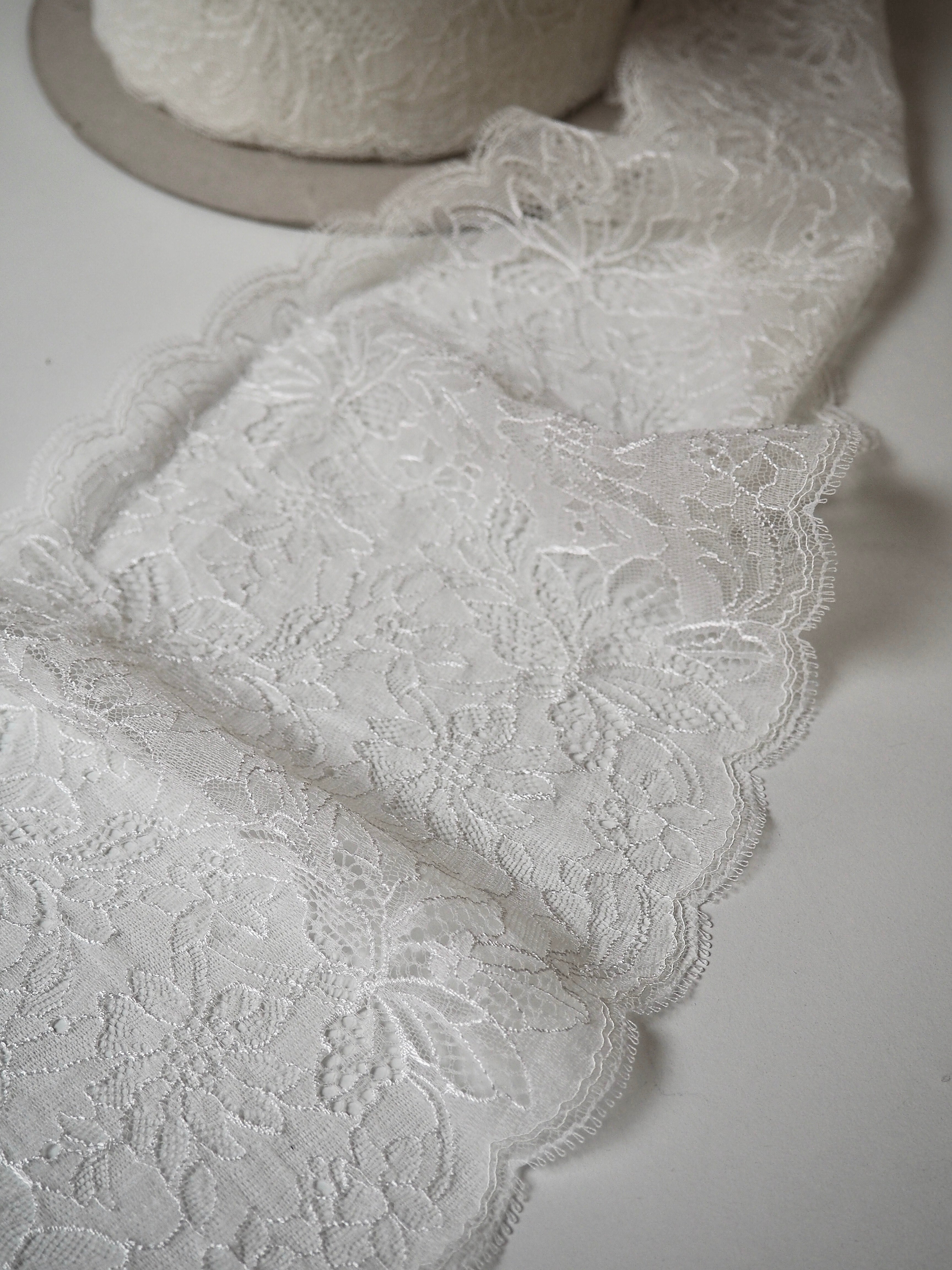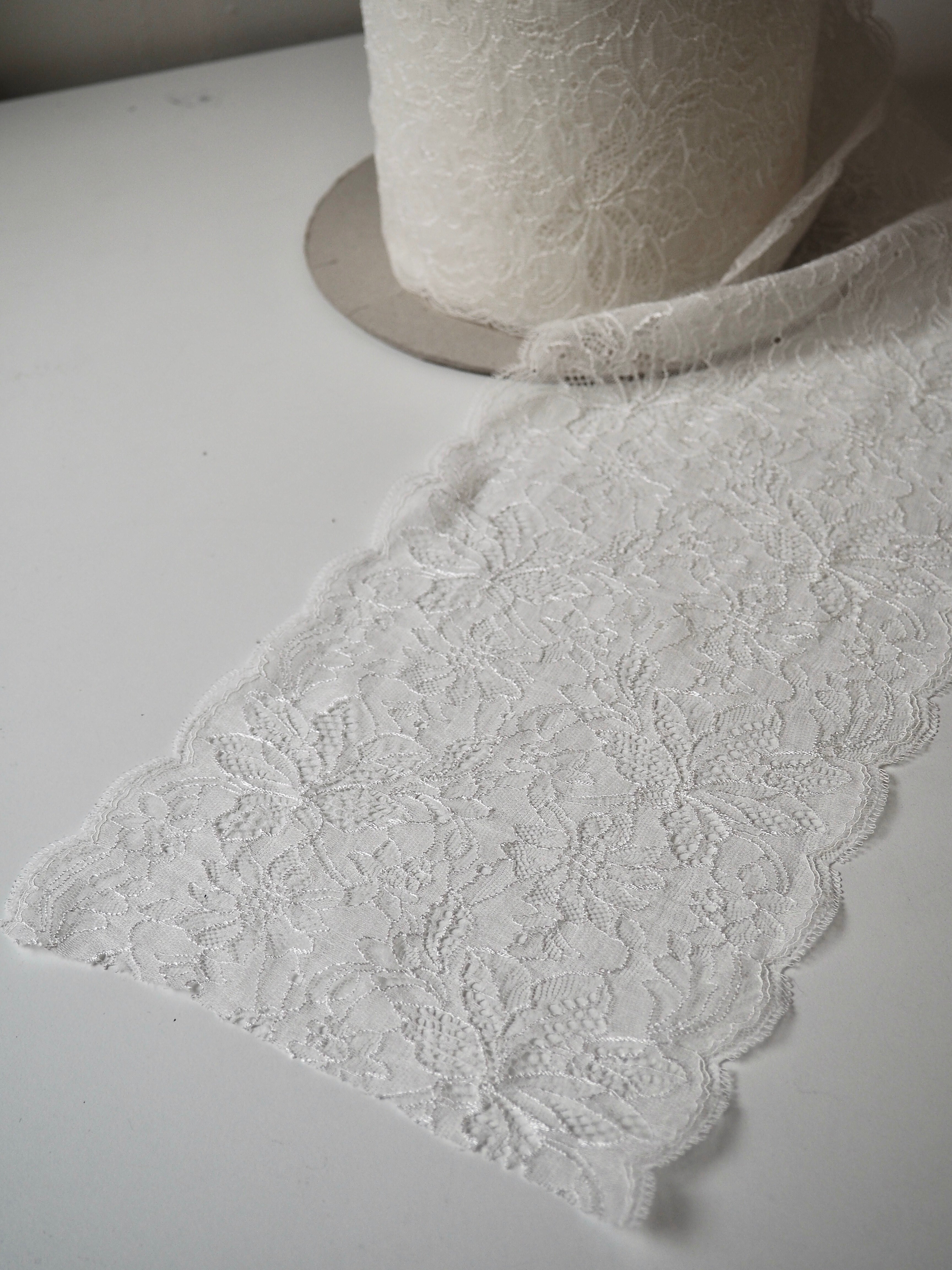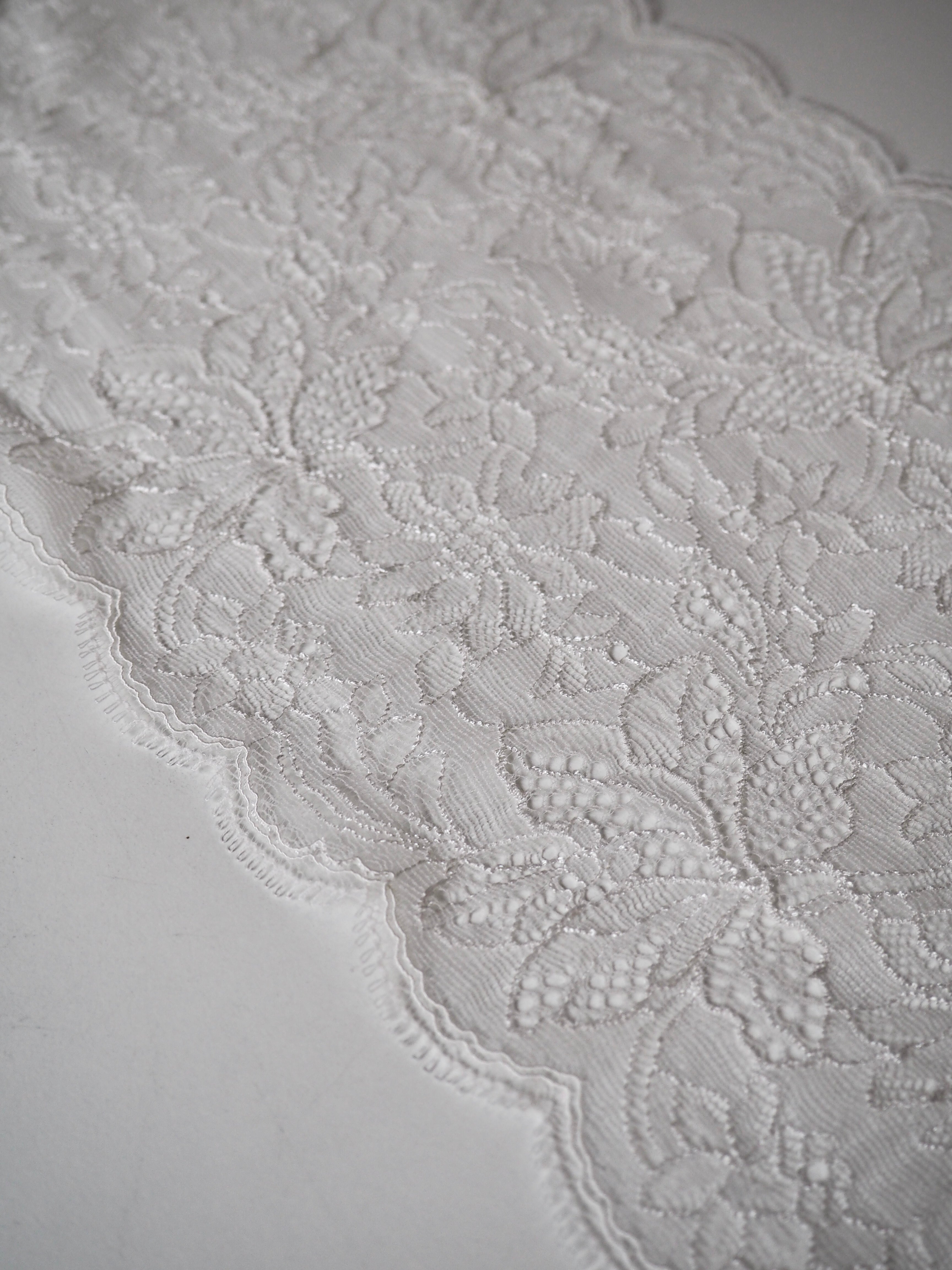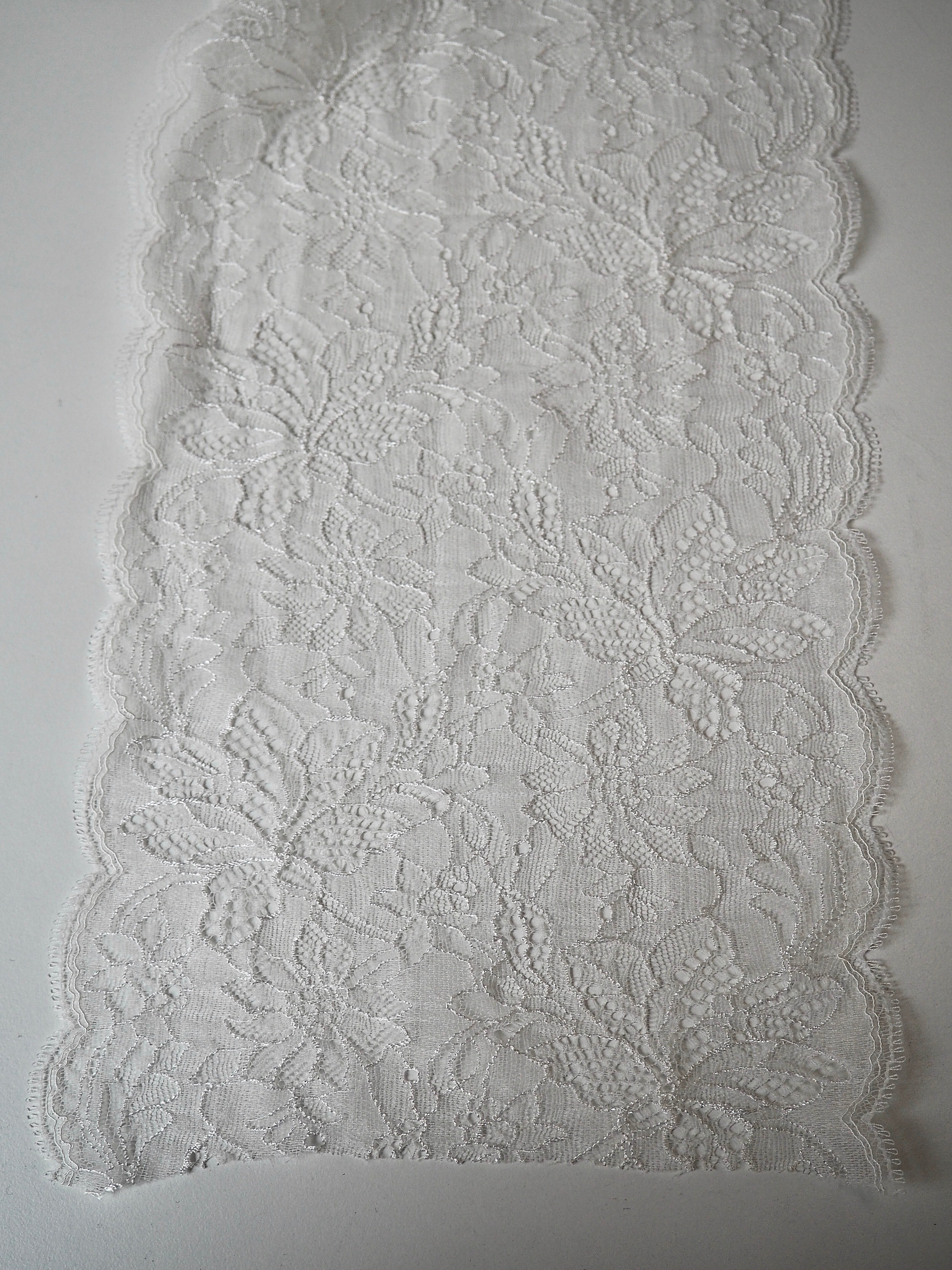 This ex-designer trim is a creamy white scallop lace. It has a double scalloped edge with a looped detail and about 30% stretch. Perfect for lingerie and bra making, but could also be used as trim on other garments and accessories.