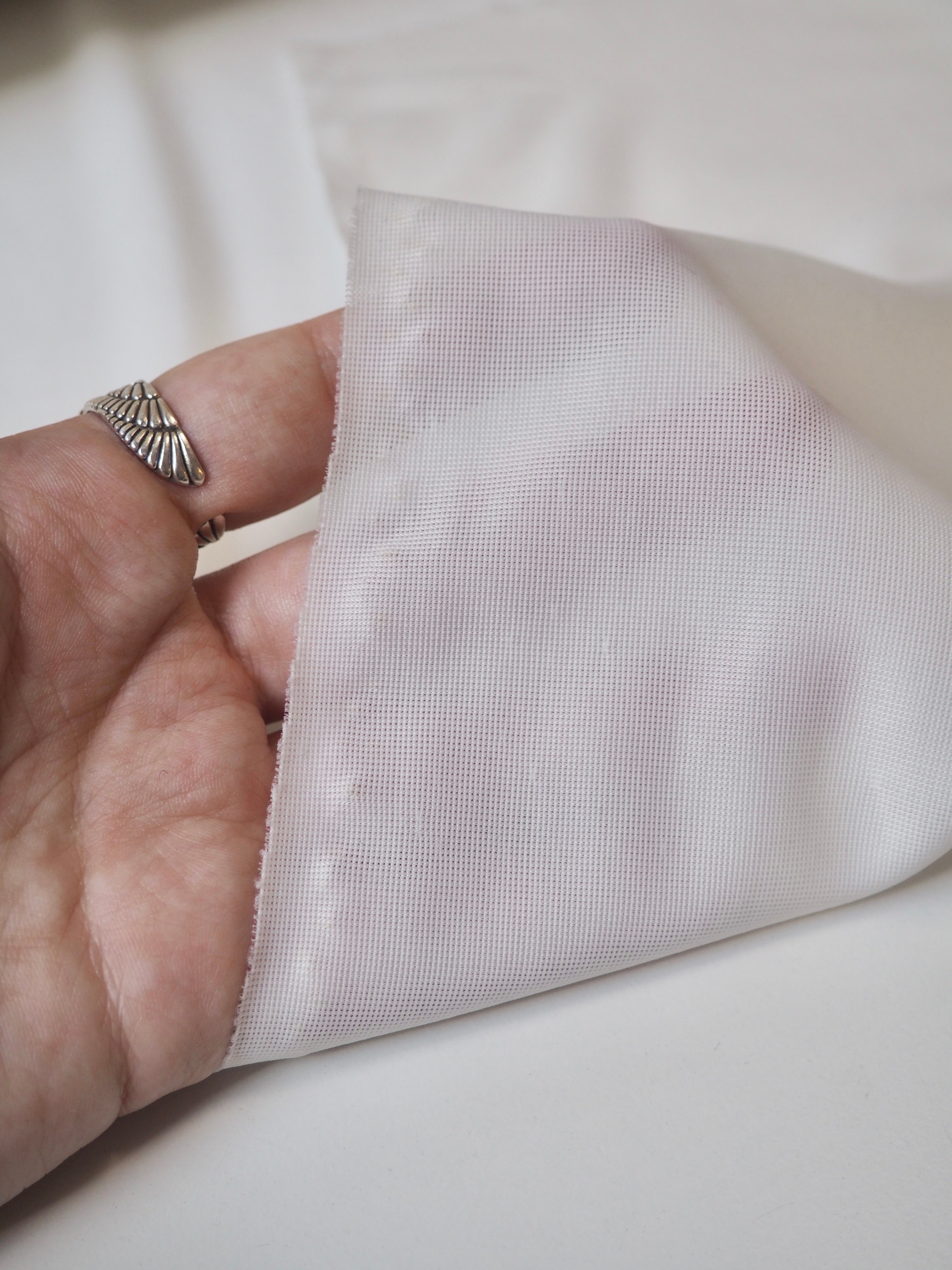 This ex-designer fabric is a powermesh. A powermesh is a mix between a powernet and a stretch mesh. It's so soft and slinky, has a dense weave like a powernet, but with more of a mesh handle. It still has amazing stretch and recovery like a powernet, and has a nice structure for lingerie! It has a smooth, shiny reverse and drapes beautifully.  This super soft mesh is so comfortable! It has a 30% stretch length-ways, and about 20% width-ways, and great recovery. Lightweight and mostly opaque, except when stretched out. Perfect for our lingerie patterns! We also have bra findings kits!
