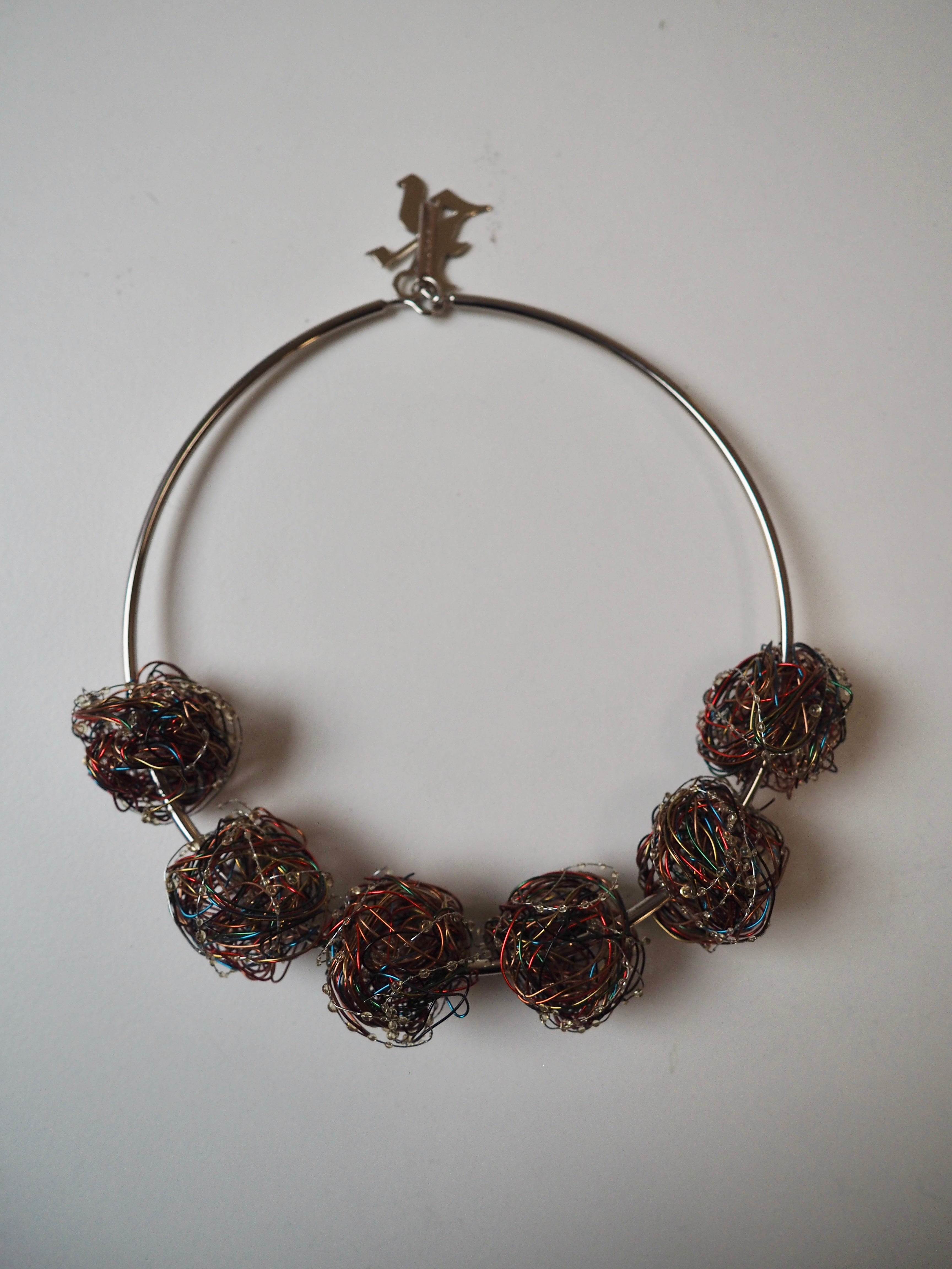 This ex-designer jewellery is a unique designer necklace. It's multi-colour wrapped wire nest like bead balls sit on a solid structured silver ring. It has a hook and loop secure closure with a branded tag attached.