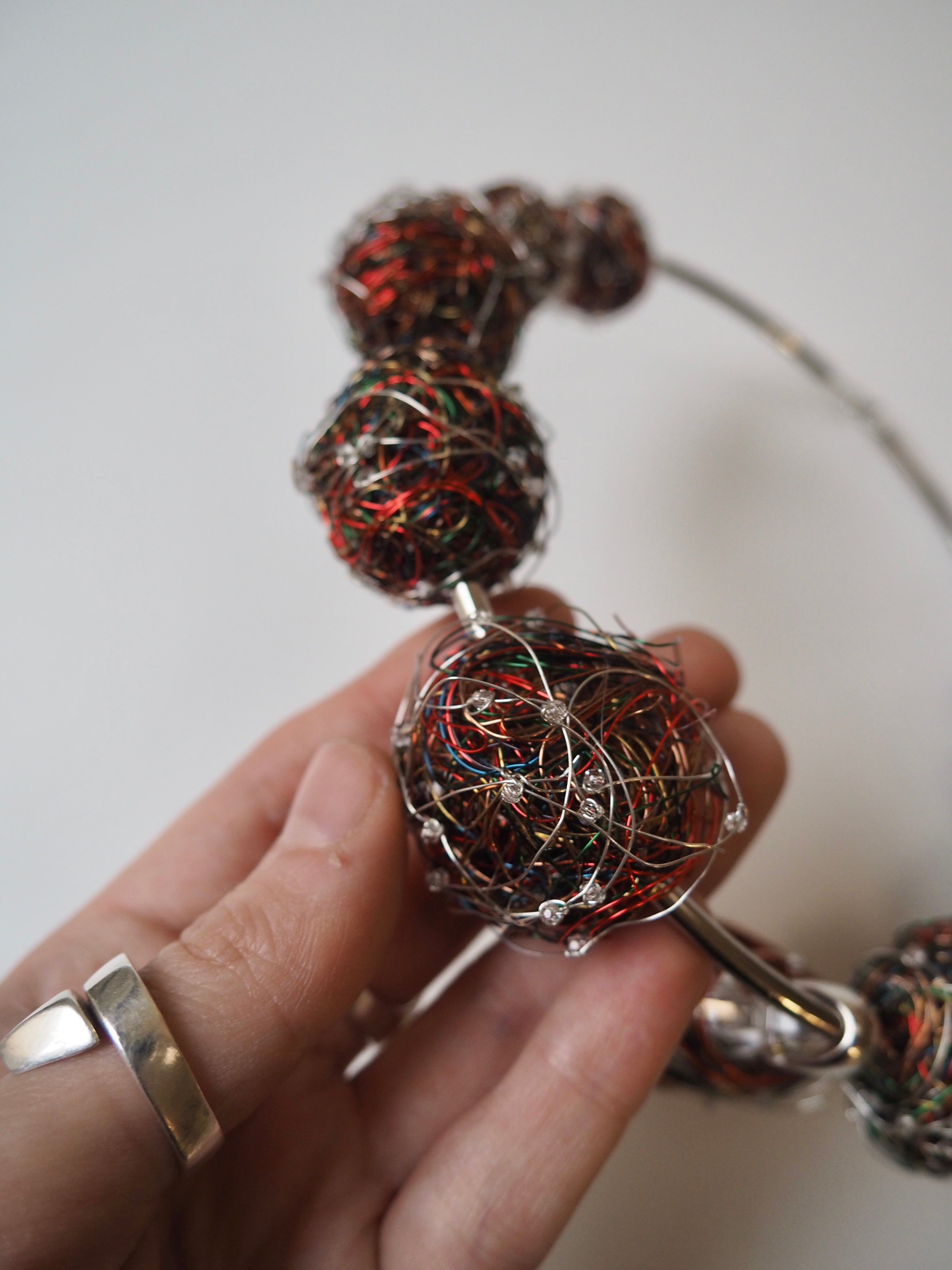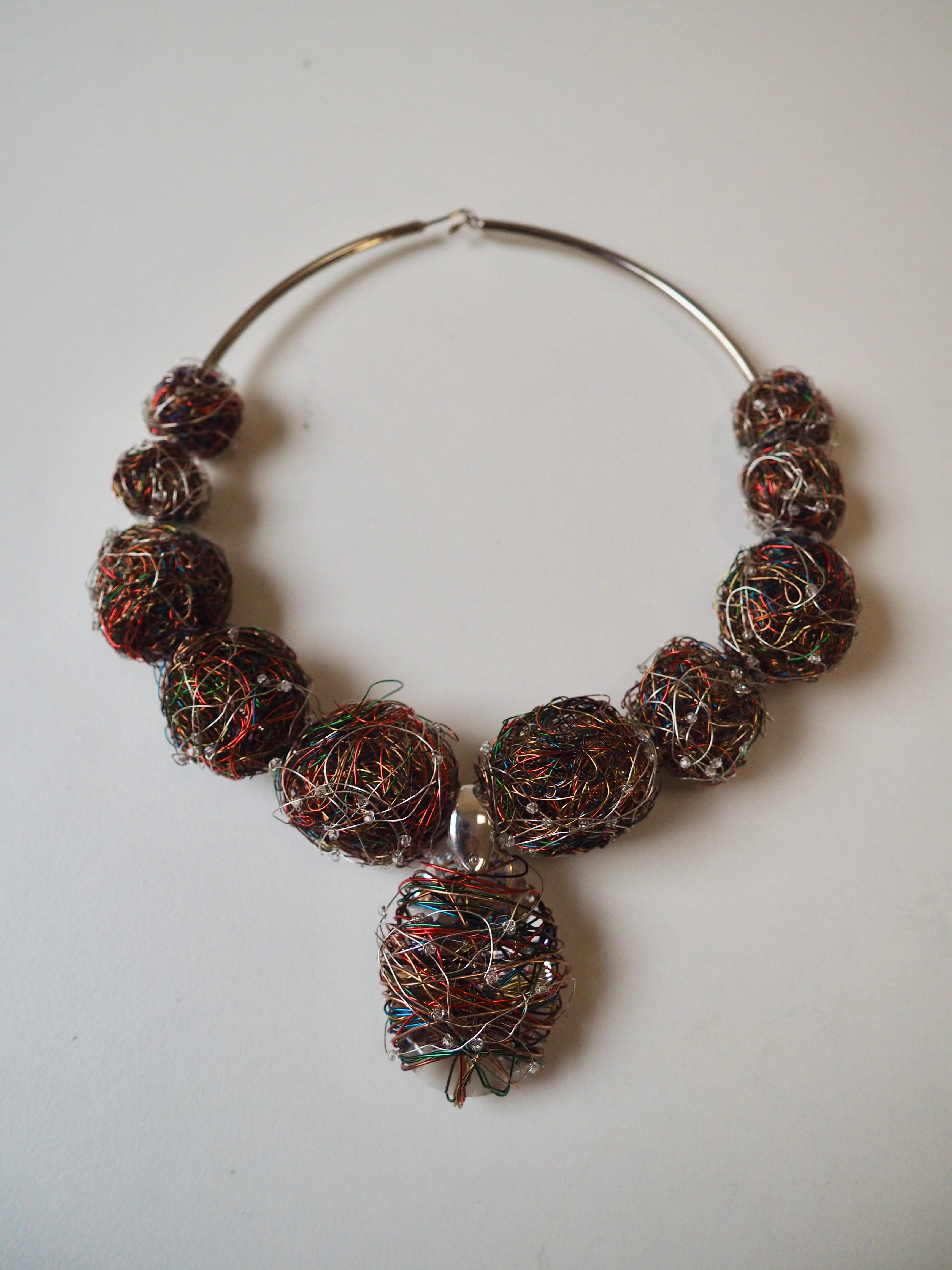 This ex-designer jewellery is a unique designer necklace. It's multi-colour wrapped wire nest like bead balls sit on a solid structured silver ring. It has a hook and loop secure closure and a central teardrop pedant also wrapped in wire and beaded wire.
