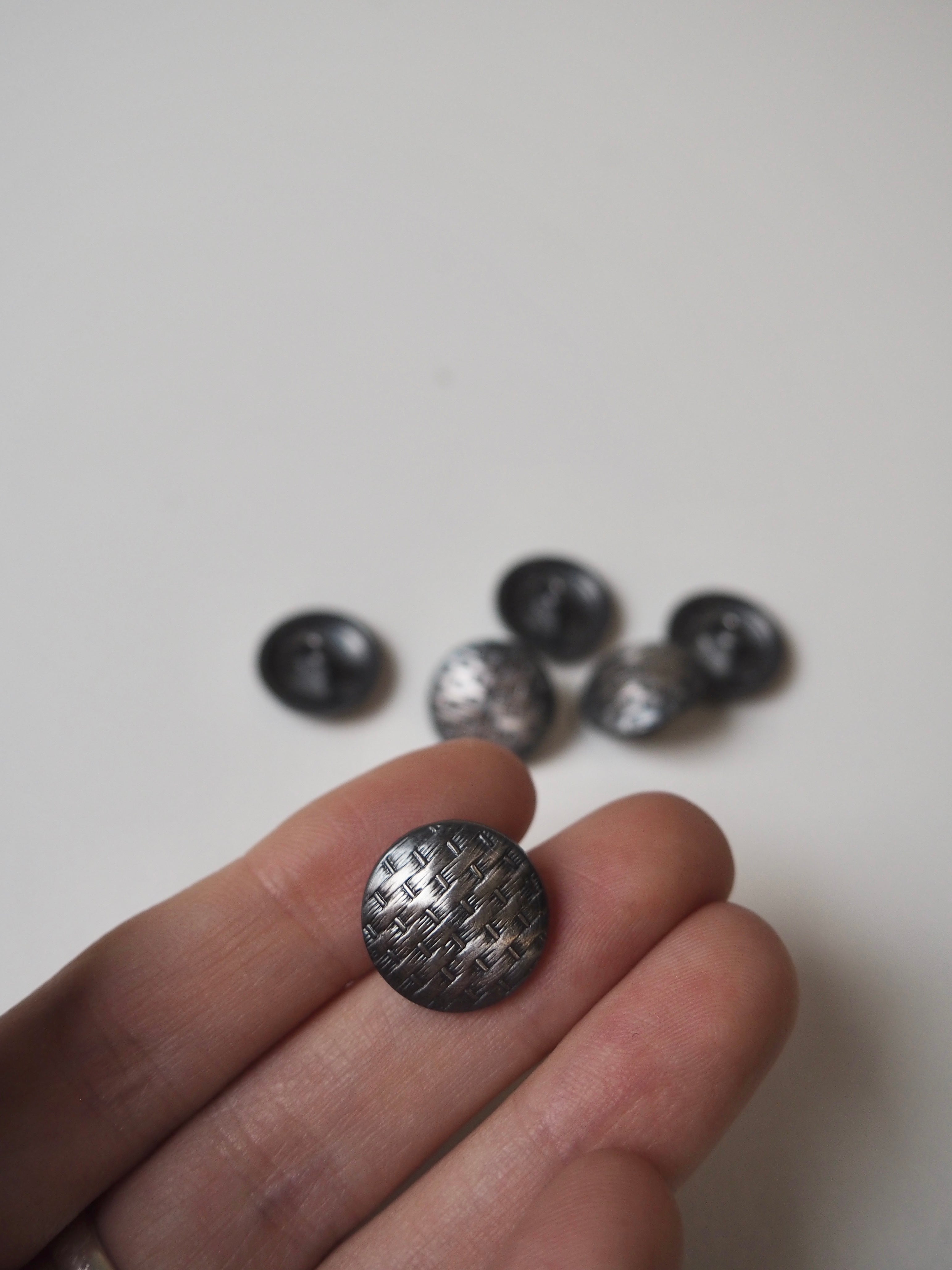 This ex-designer trim is a metal shank button. They have a textured raised surface with a woven design and is a gunmetal colour with a lighter silver colour in the centre. Perfect size for shirts, jackets and cardigans.