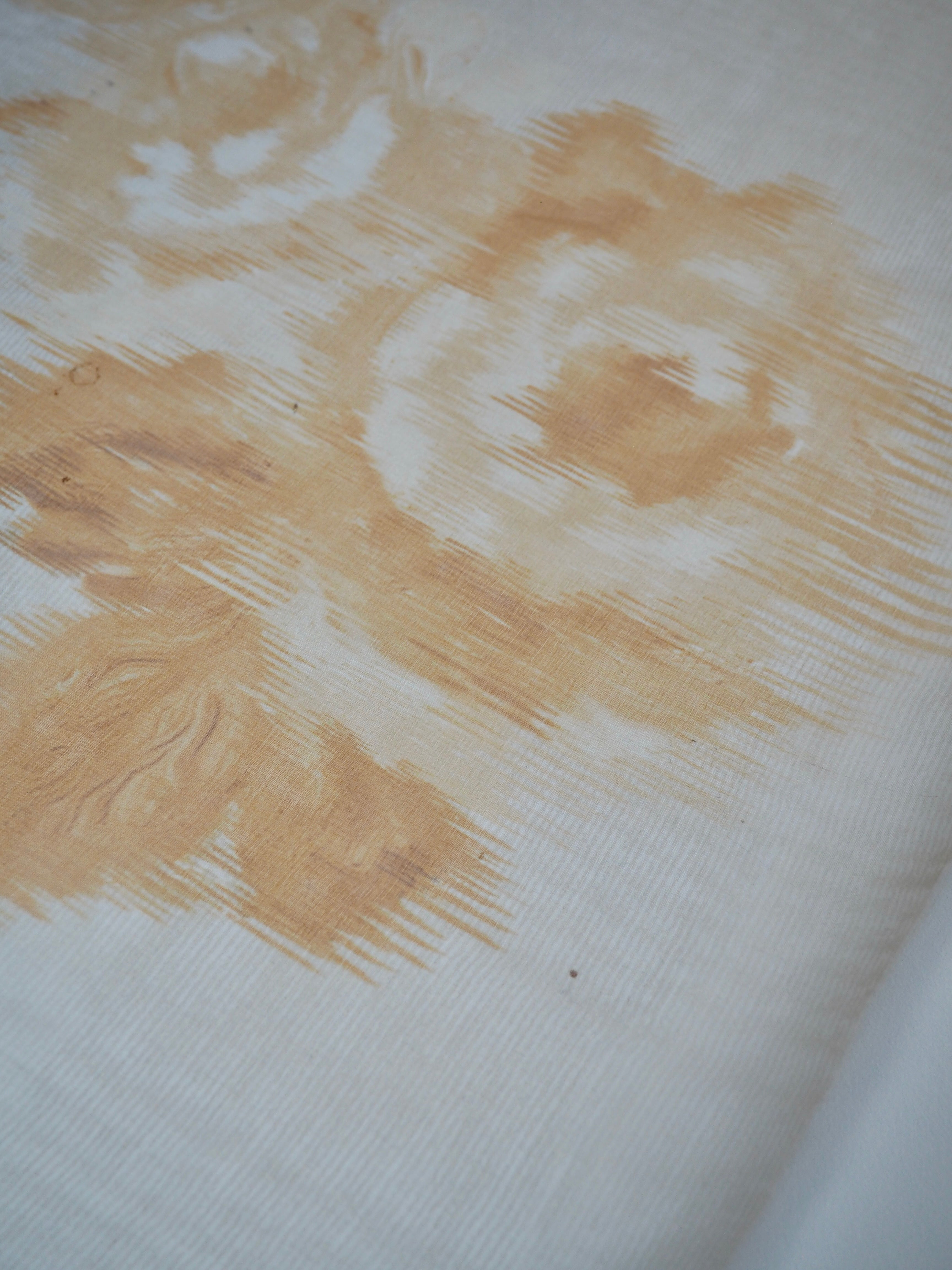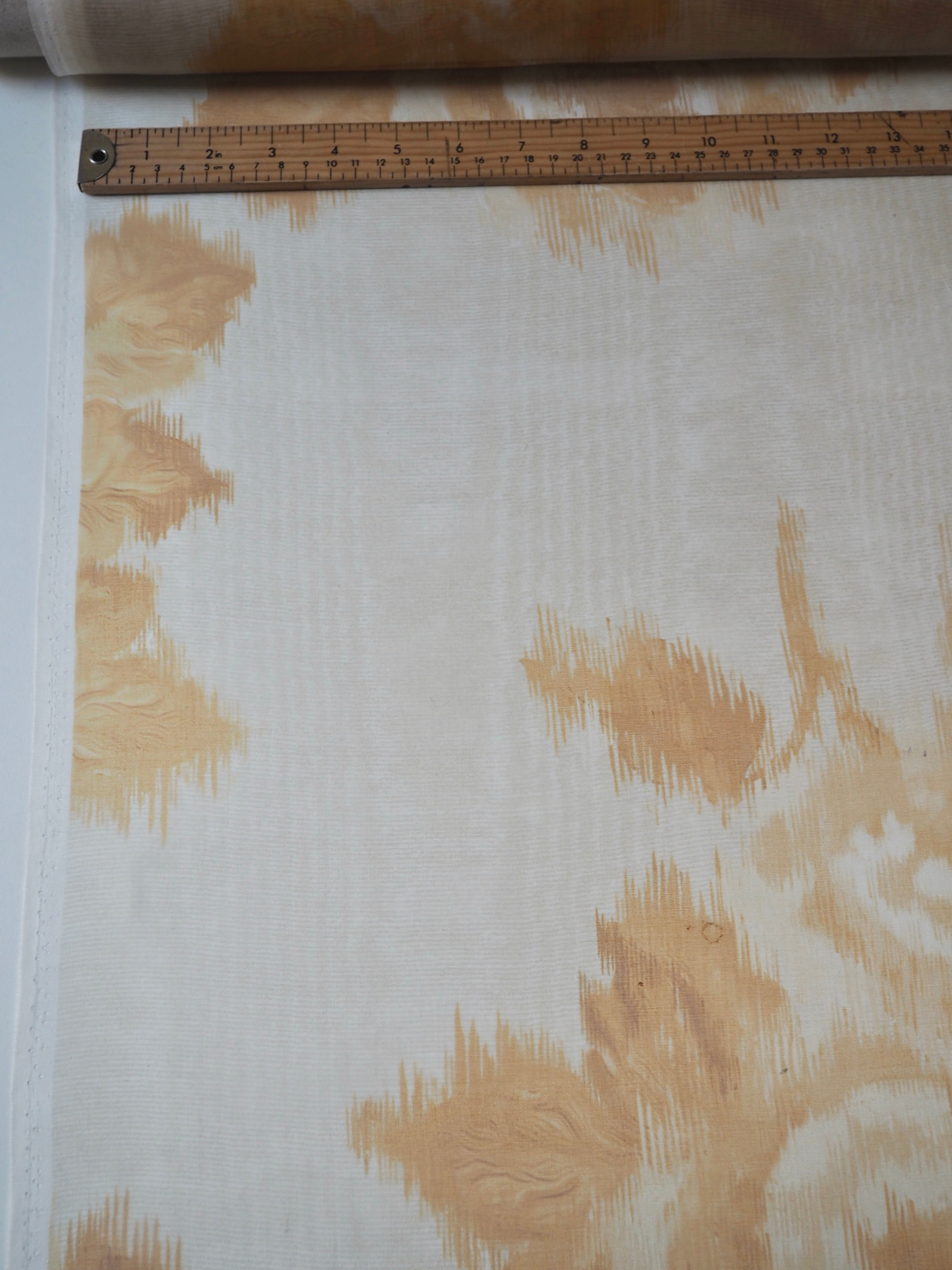This ex-designer fabric is a silk organza. Yellow roses are moiré warp printed on this organza. It was a bespoke print for the London-based designer. It has a beautiful sheen finish that catches the light as it moves. Sheer, with a luxurious handle and lovely structure. Perfect for use in occasion wear, and it stands away from the body really well. Also great for simple tops, sheer scrunchies, and overlays!