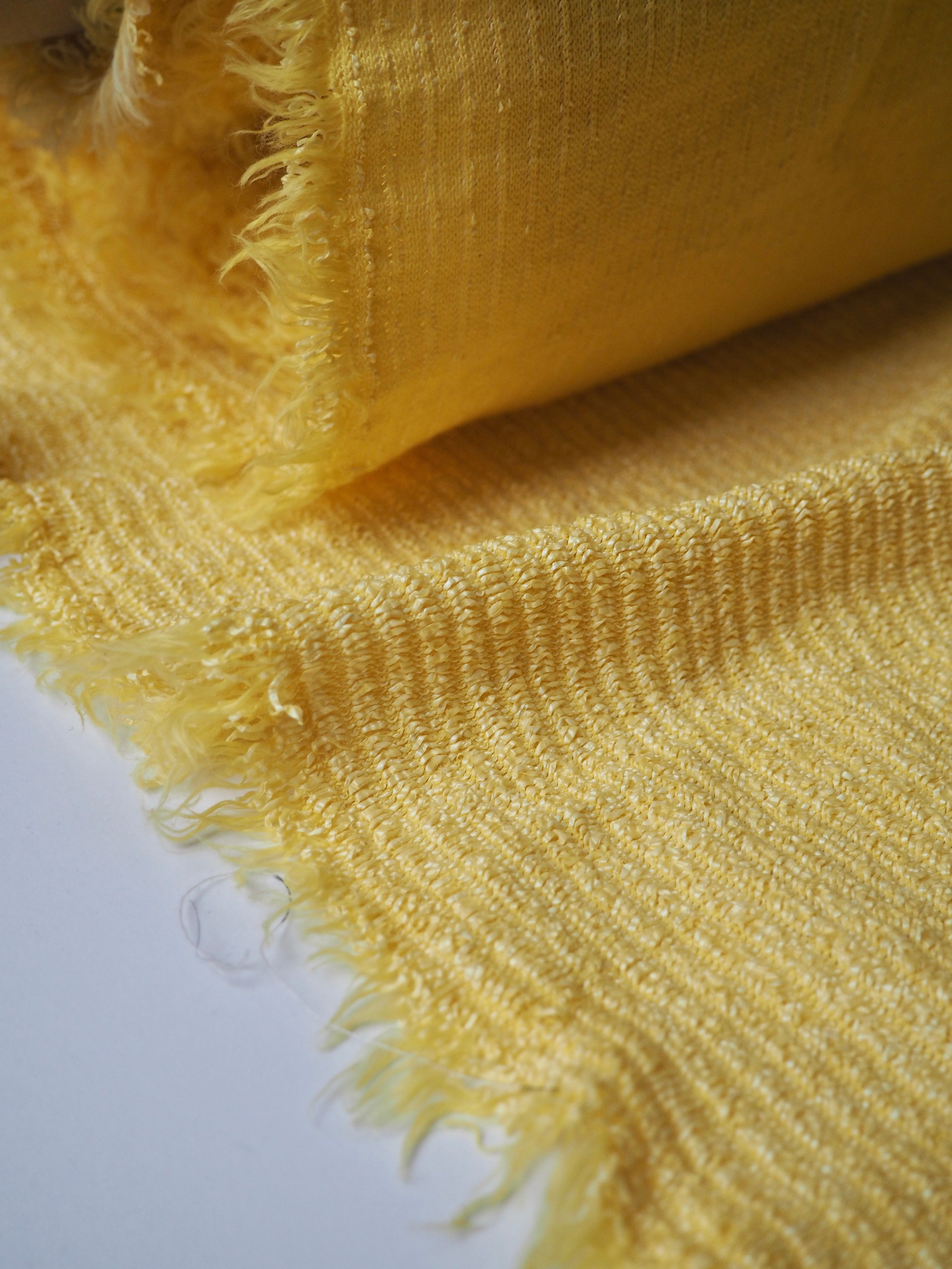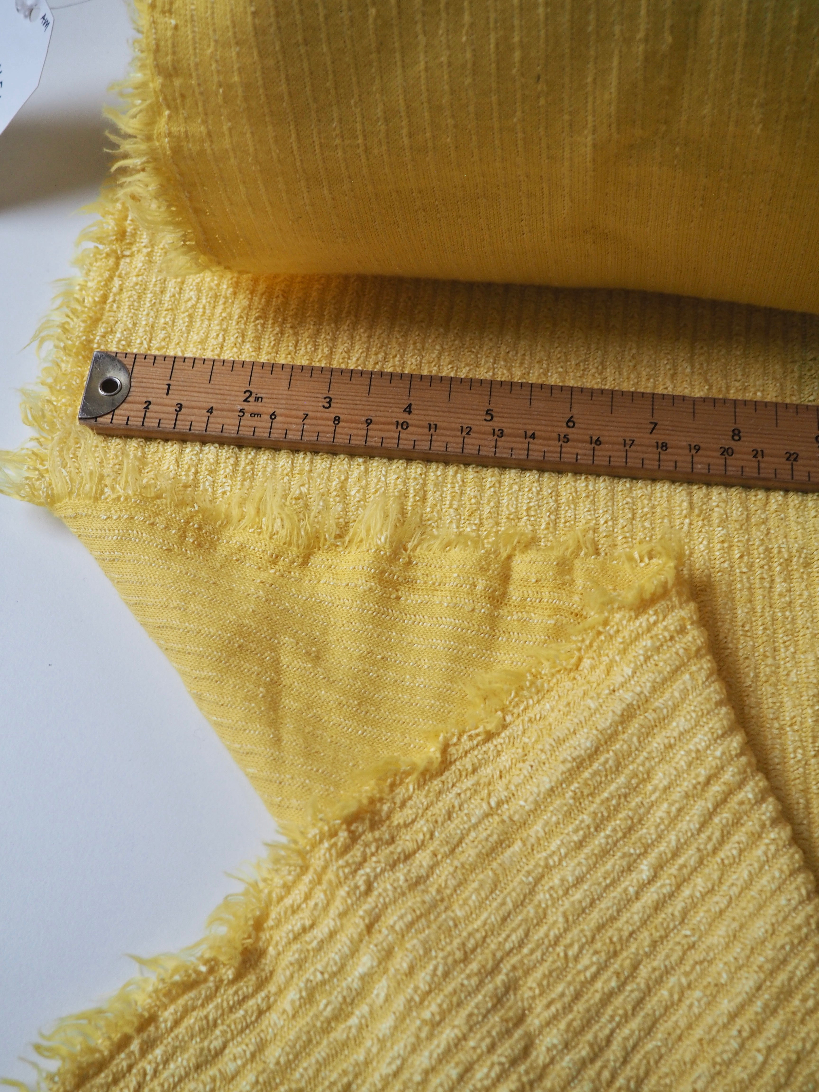 This ex-designer fabric is a unique jersey. It's a bright yellow shade, with a ribbed-looking stripe structure and raffia-like fibres woven in. It gives it a vibrant but unique colour and textured combination. Has a nice textured handle. Medium weight with approximately 20% stretch both ways and a lovely bouncy drape. Slightly sheer due to the mesh weave. Would make the perfect holiday dress or top!