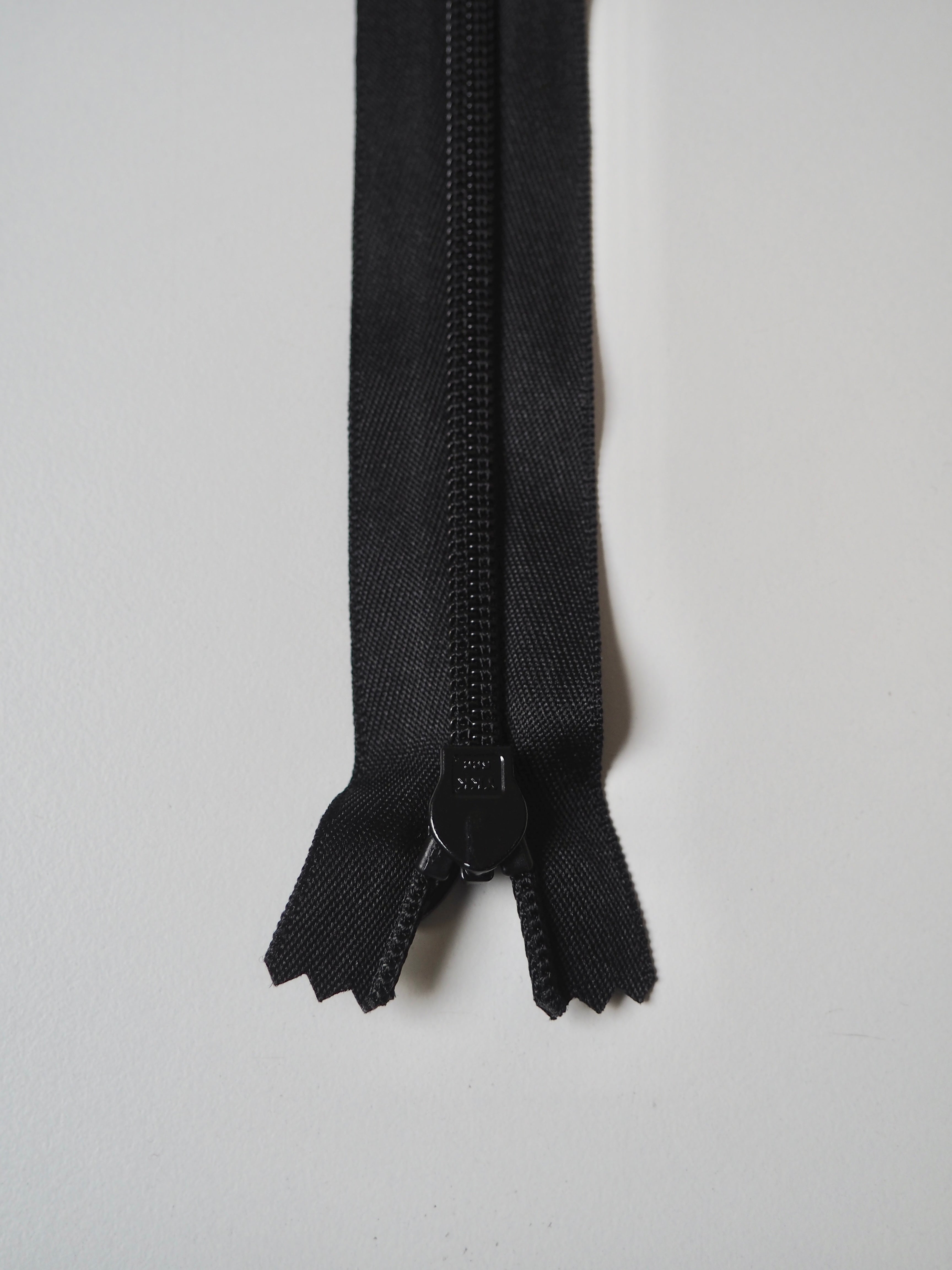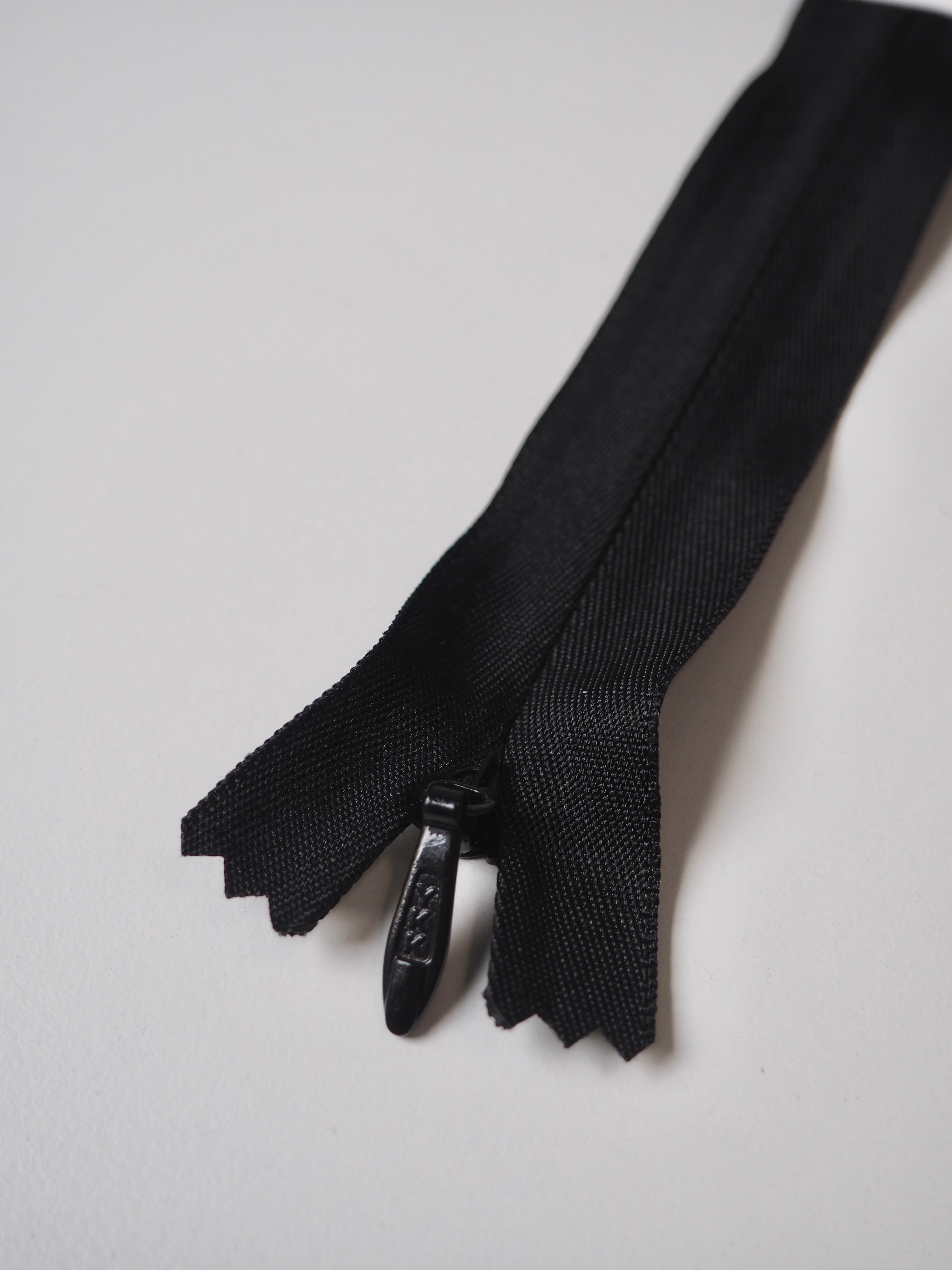 This ex-designer trim is a deadstock zip. Amazing quality and sturdy. Close-ended, black invisible zip with matching plastic teeth, extra wide zip tape and larger metal zipper pull.